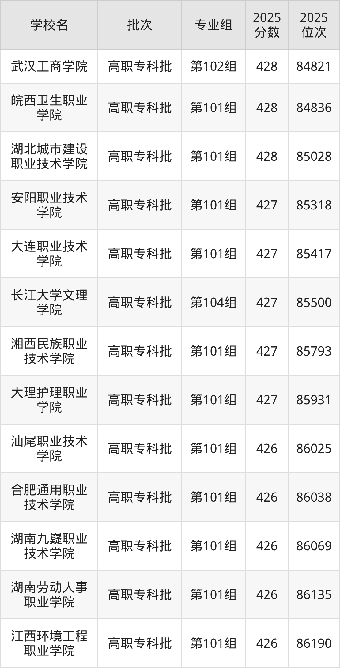 另外录取位次低于该区间(较稳妥)的有汕尾职业技术学院第101组(86025名)、合肥通用职业技术学院第101组(86038名)等;录取位次高于该区间(可冲)的有湖北城市建设职业技术学院第101组(85028名)、皖西卫生职业学院第101组(84836名)等。