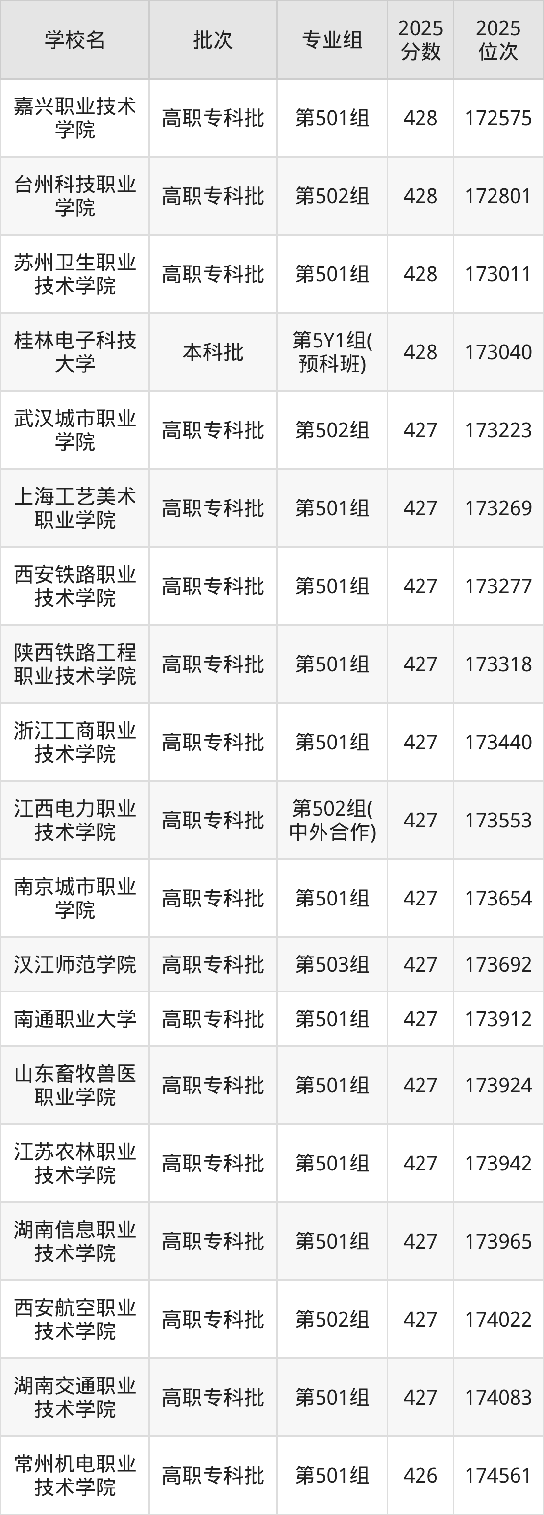 2025年江西高考物理类427分(173044名~174089名)能上的大学有汉江师范学院第503组、南京城市职业学院第501组、上海工艺美术职业学院第501组、江苏农林职业技术学院第501组等。
