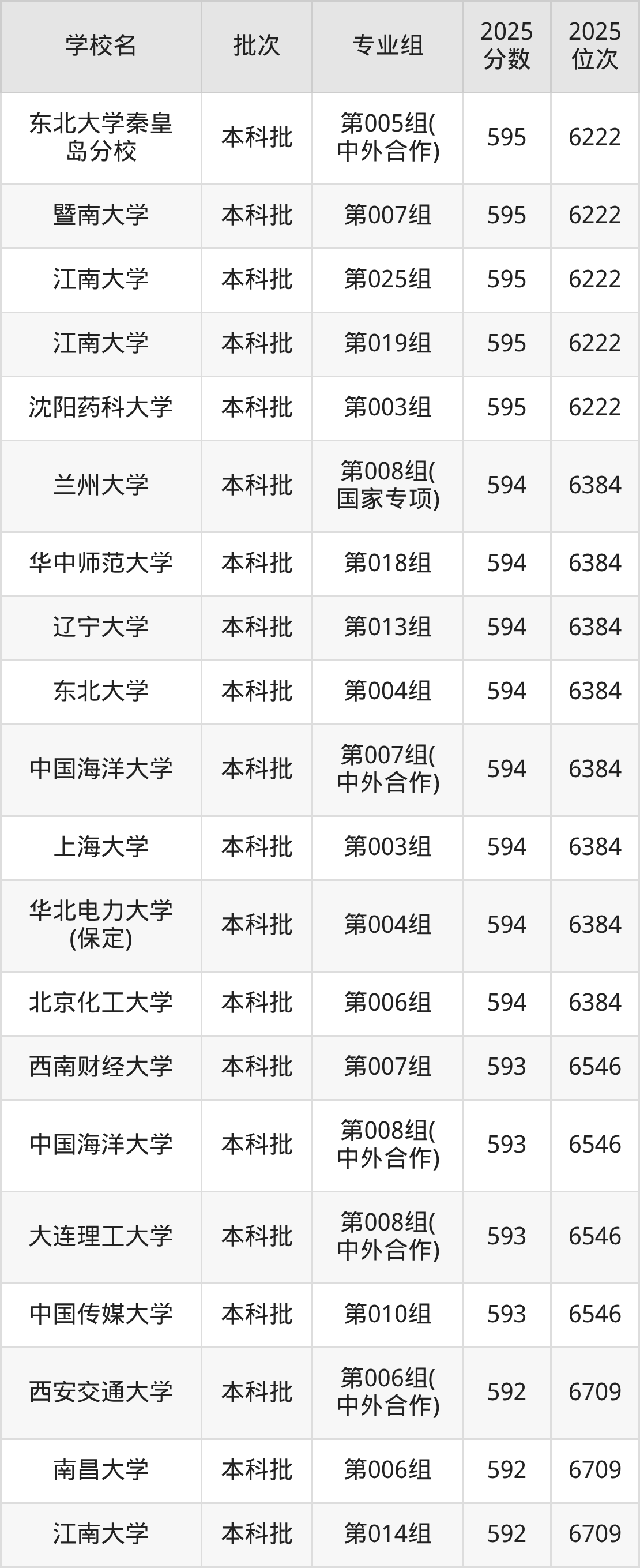 2025年吉林高考物理类595分(6092名~6222名)能上的大学有东北大学秦皇岛分校第005组(中外合作)、沈阳药科大学第003组、江南大学第019组、江南大学第025组等。