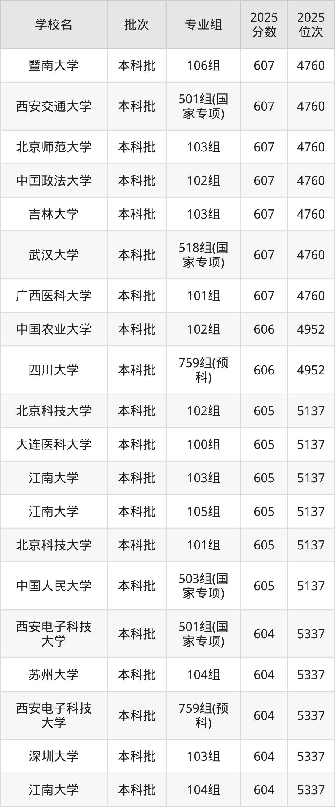 广西高考604分:历史类排名1050位、物理类排名5337位。该分数位次对应能上的大学历史类有南京师范大学101组、暨南大学101组;物理类有中央财经大学102组、苏州大学104组,更多名单如下文所示,2026届考生可参考。