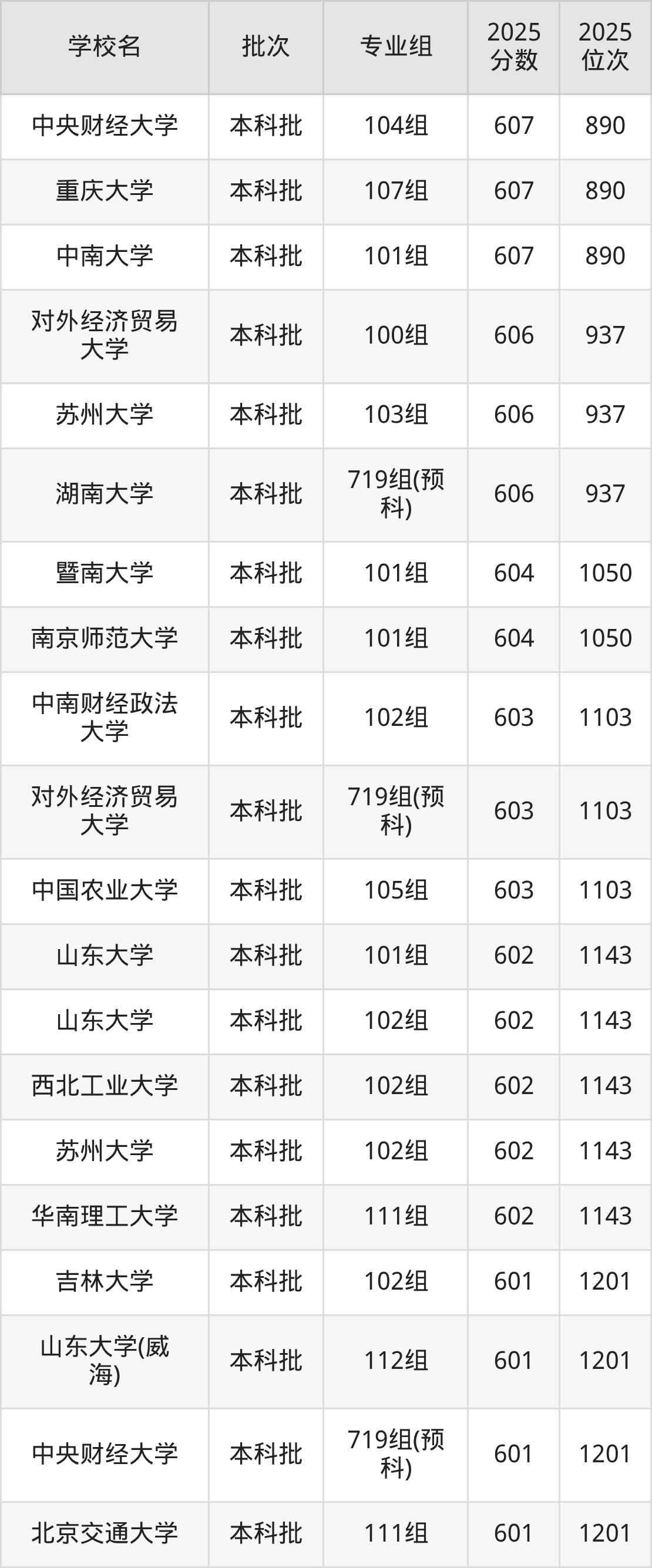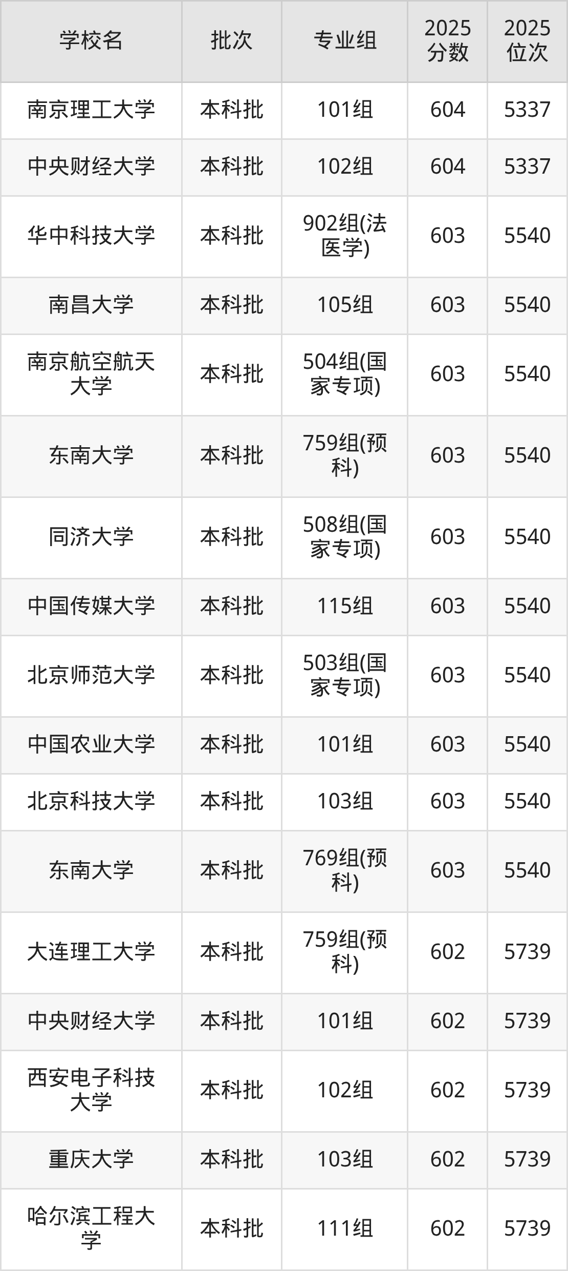 2025年广西高考物理类604分(5138名~5337名)能上的大学有中央财经大学102组、苏州大学104组、南京理工大学101组、江南大学104组等。