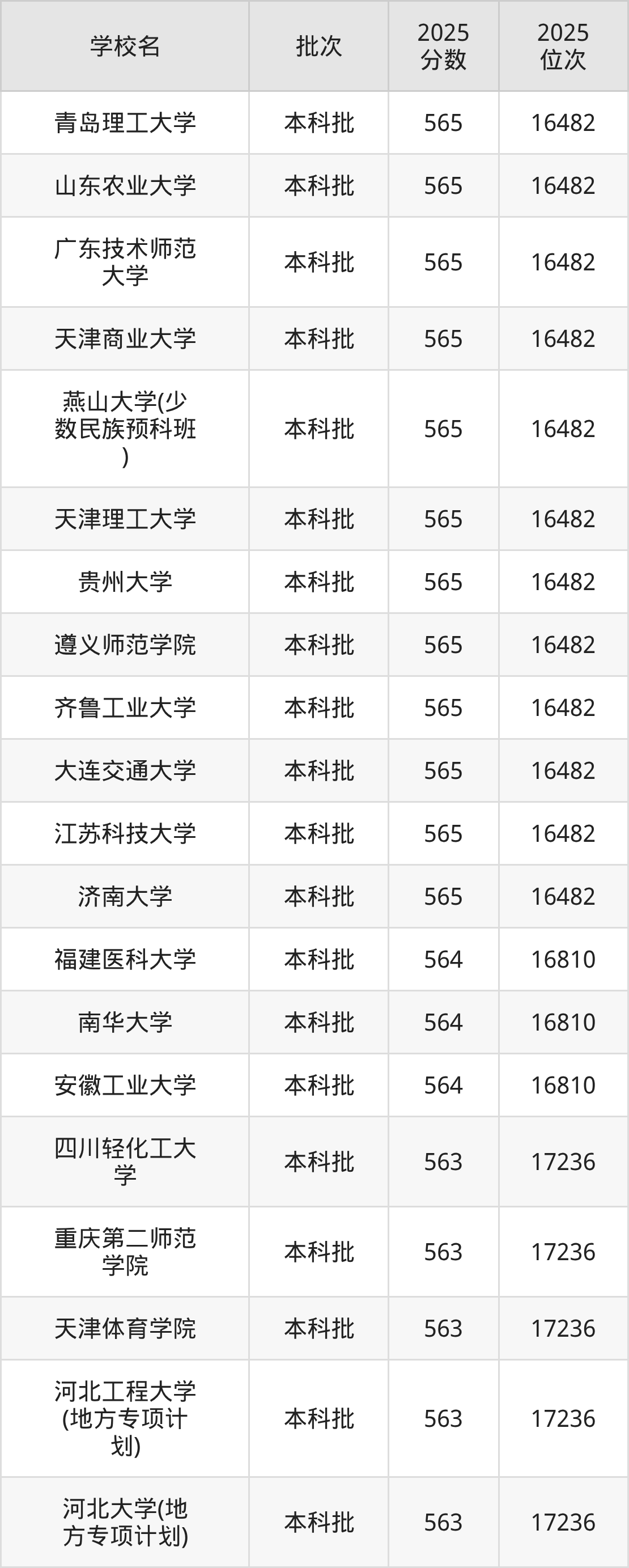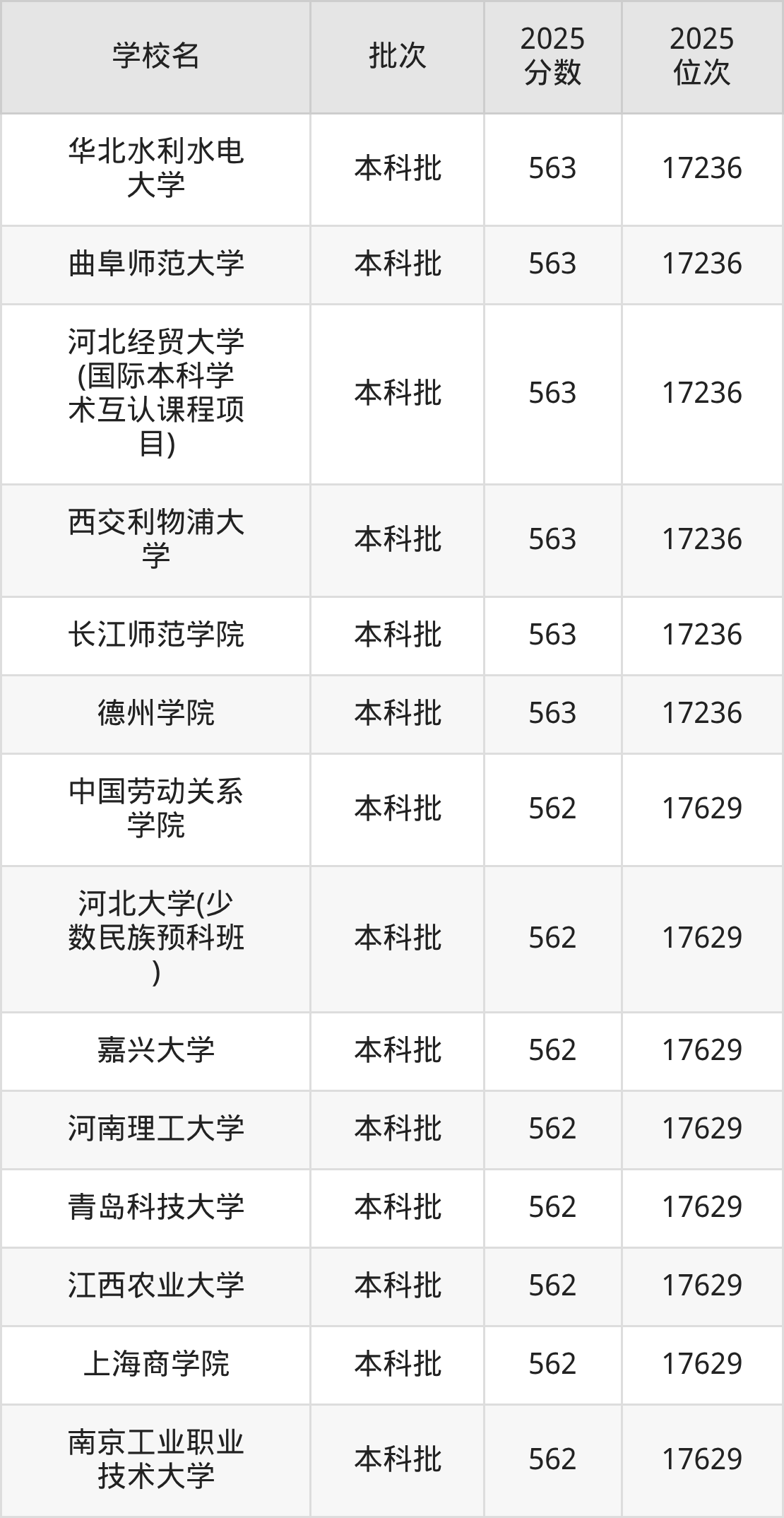 2025年河北高考历史类563分(16811名~17236名)能上的大学有华北水利水电大学、曲阜师范大学、西交利物浦大学、长江师范学院等。