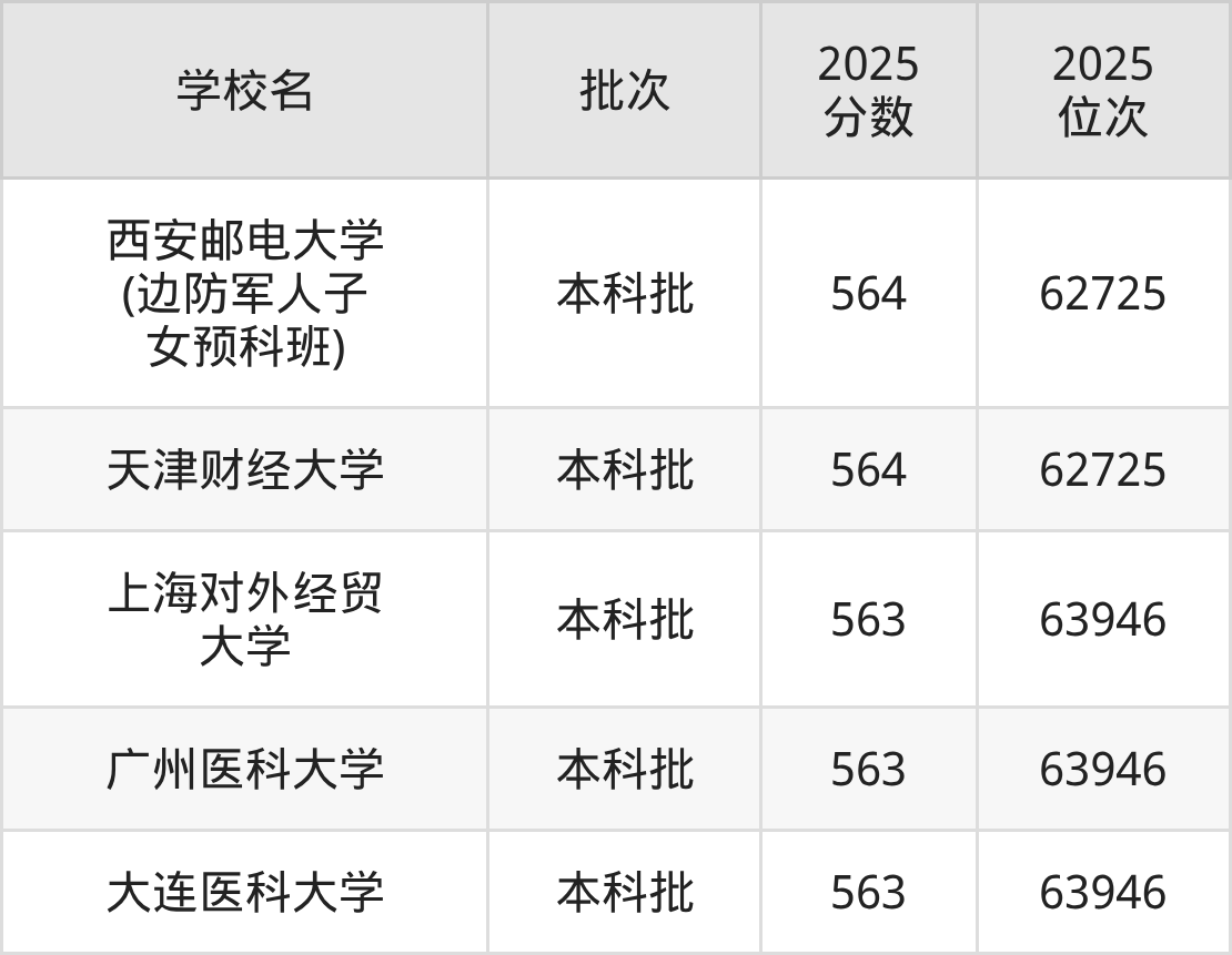2025年河北高考物理类563分(62726名~63946名)能上的大学有上海对外经贸大学、广州医科大学、大连医科大学。