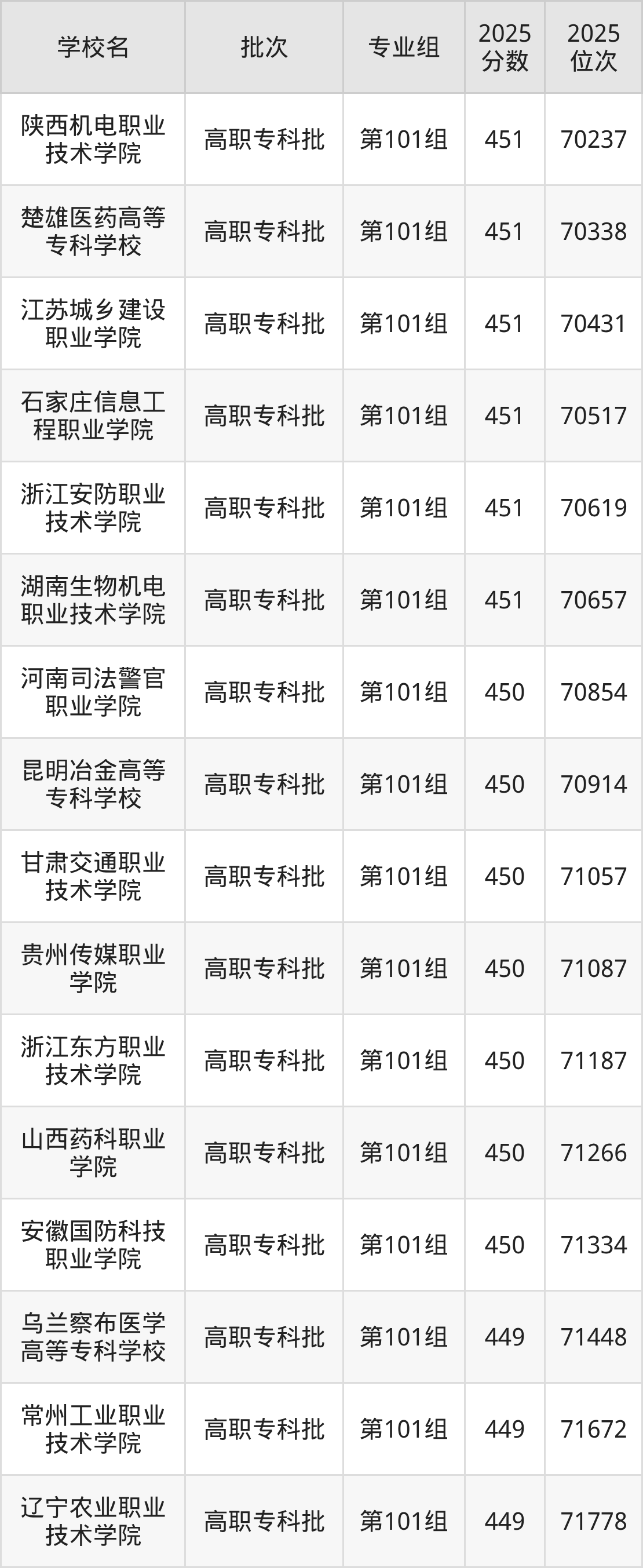 2025年江西高考历史类450分(70731名~71381名)能上的大学有浙江东方职业技术学院第101组、贵州传媒职业学院第101组、昆明冶金高等专科学校第101组、安徽国防科技职业学院第101组等。