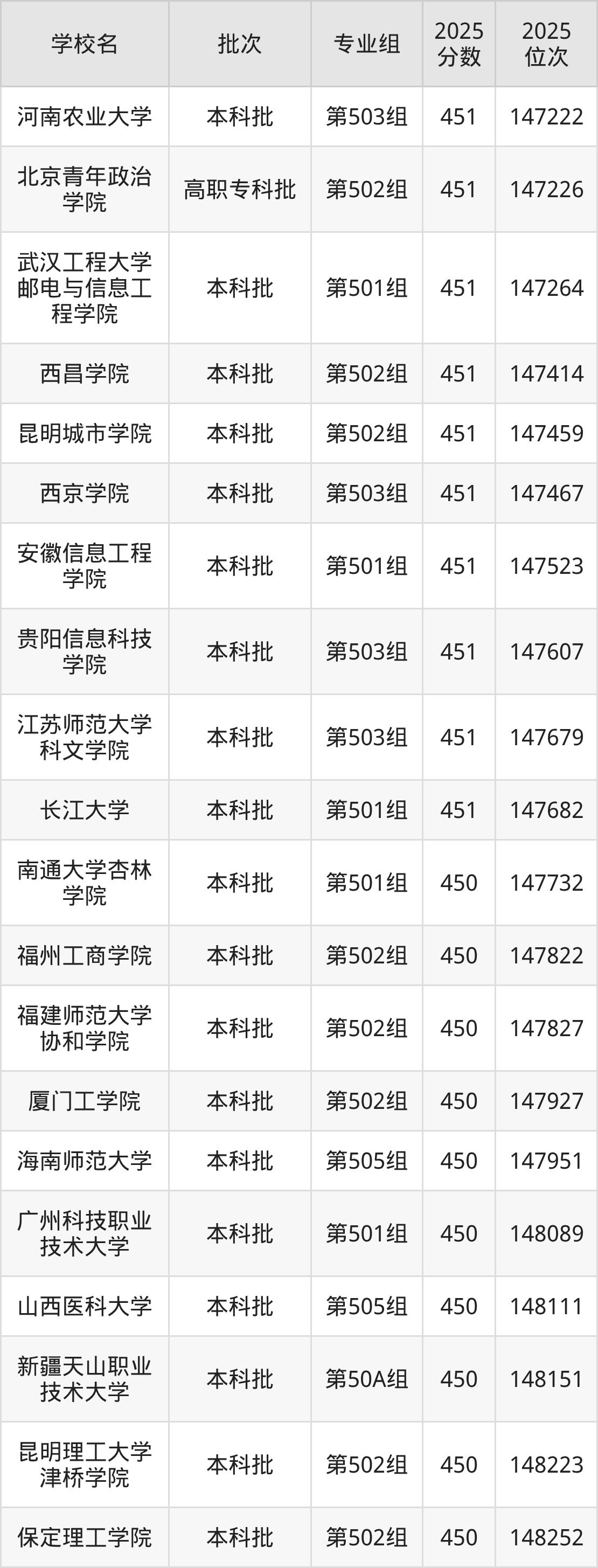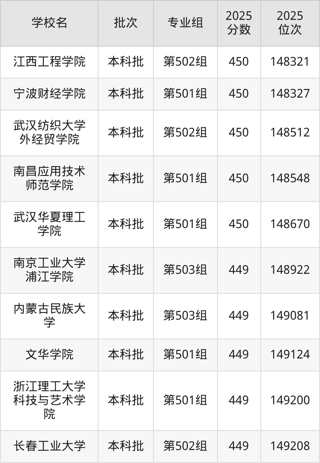 2025年江西高考物理类450分(147683名~148841名)能上的大学有海南师范大学第505组、山西医科大学第505组、宁波财经学院第501组、广州科技职业技术大学第501组等。