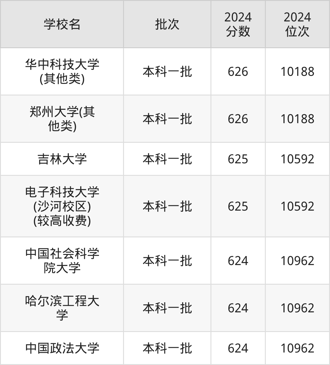 2024年河南高考理科625分(10189名~10592名)能上的大学有吉林大学、电子科技大学(沙河校区)(较高收费)。