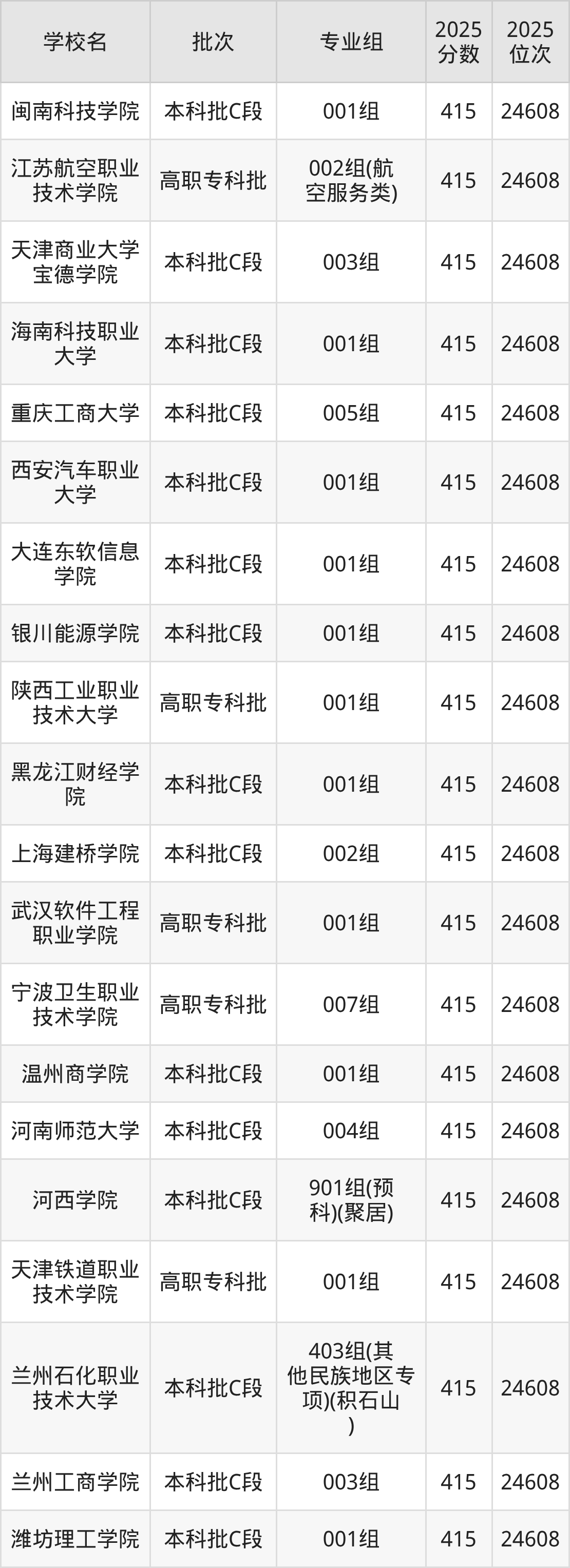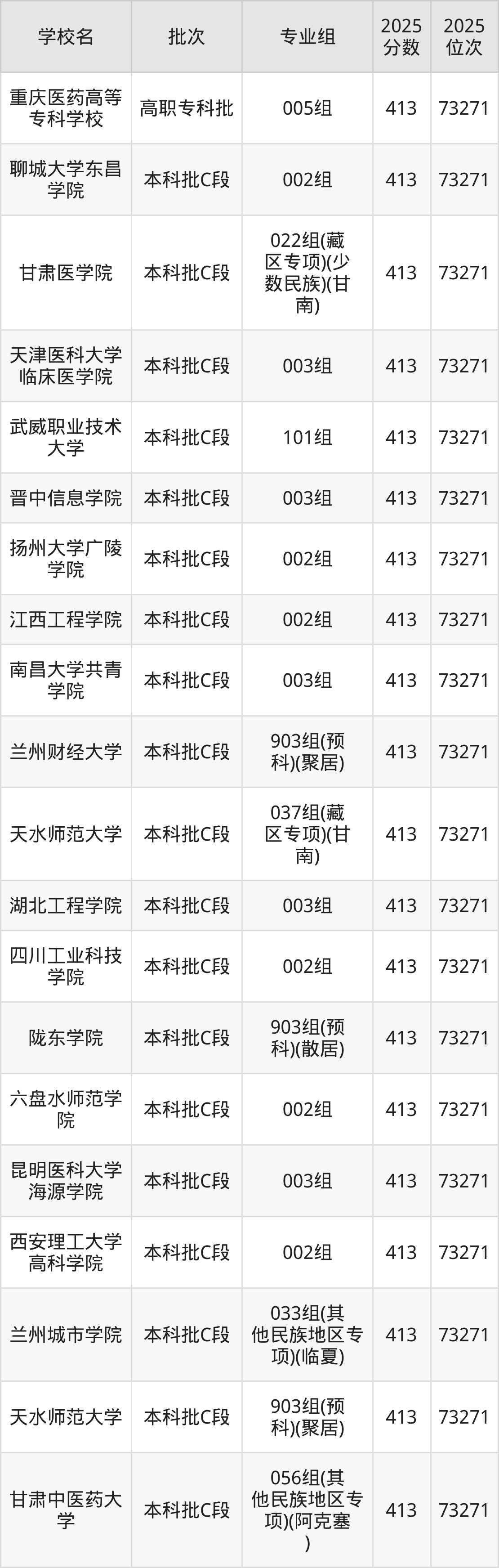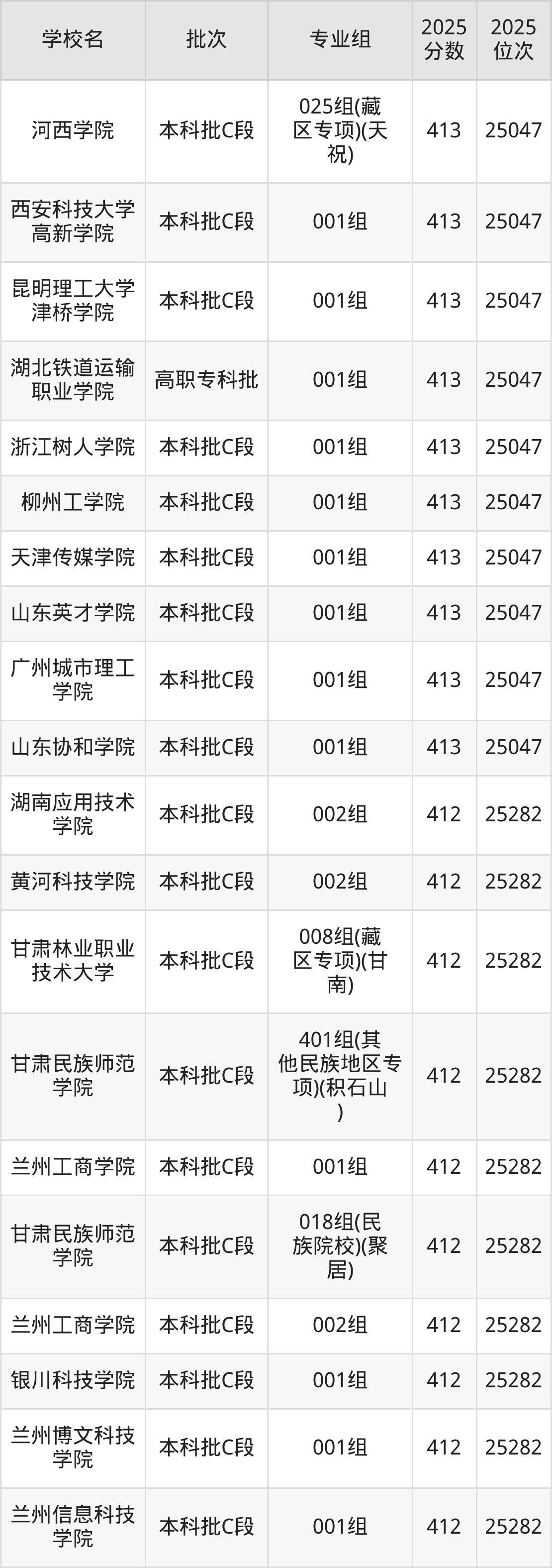 另外录取位次低于该区间(较稳妥)的有兰州文理学院901组(预科)(聚居)(25494名)、甘肃民族师范学院015组(其他民族地区专项)(少数民族)(临夏)(25494名)等;录取位次高于该区间(可冲)的有山东英才学院001组(25047名)、西安科技大学高新学院001组(25047名)等。