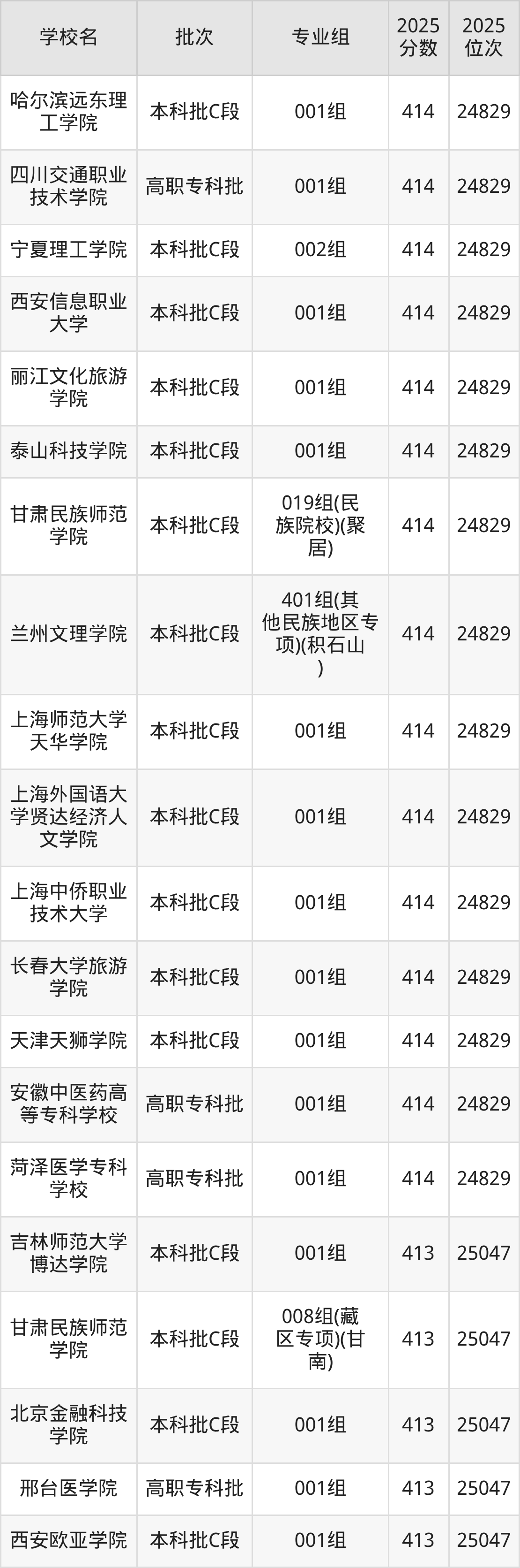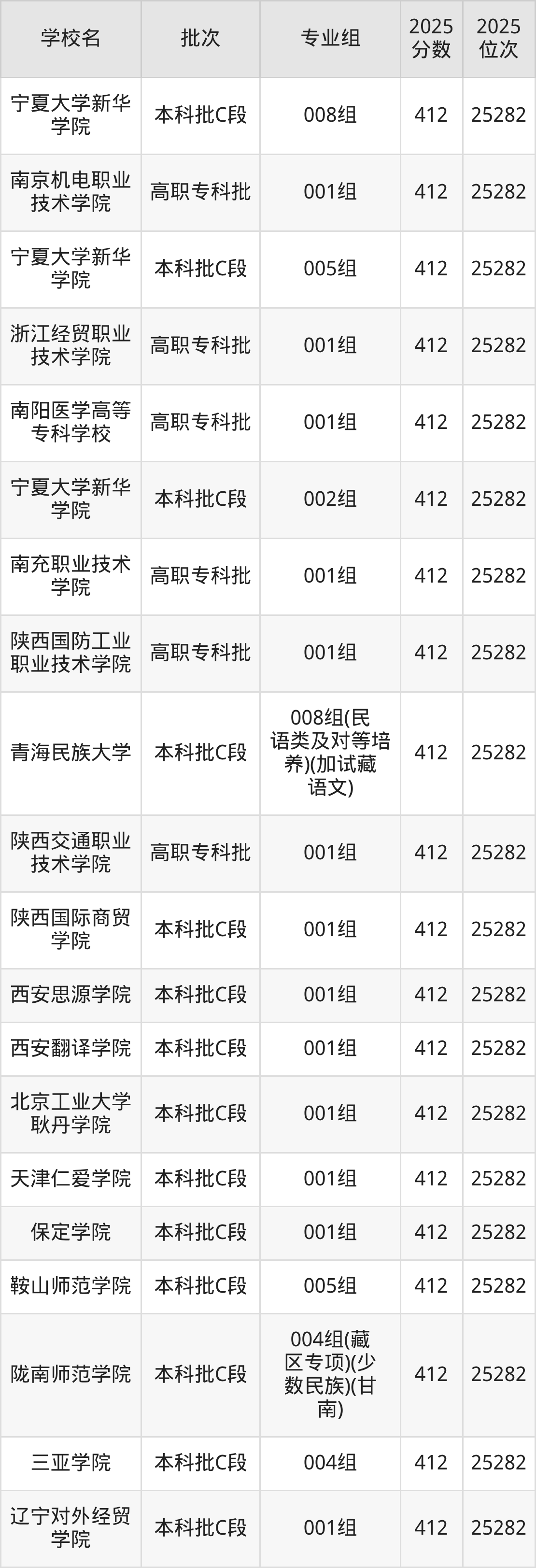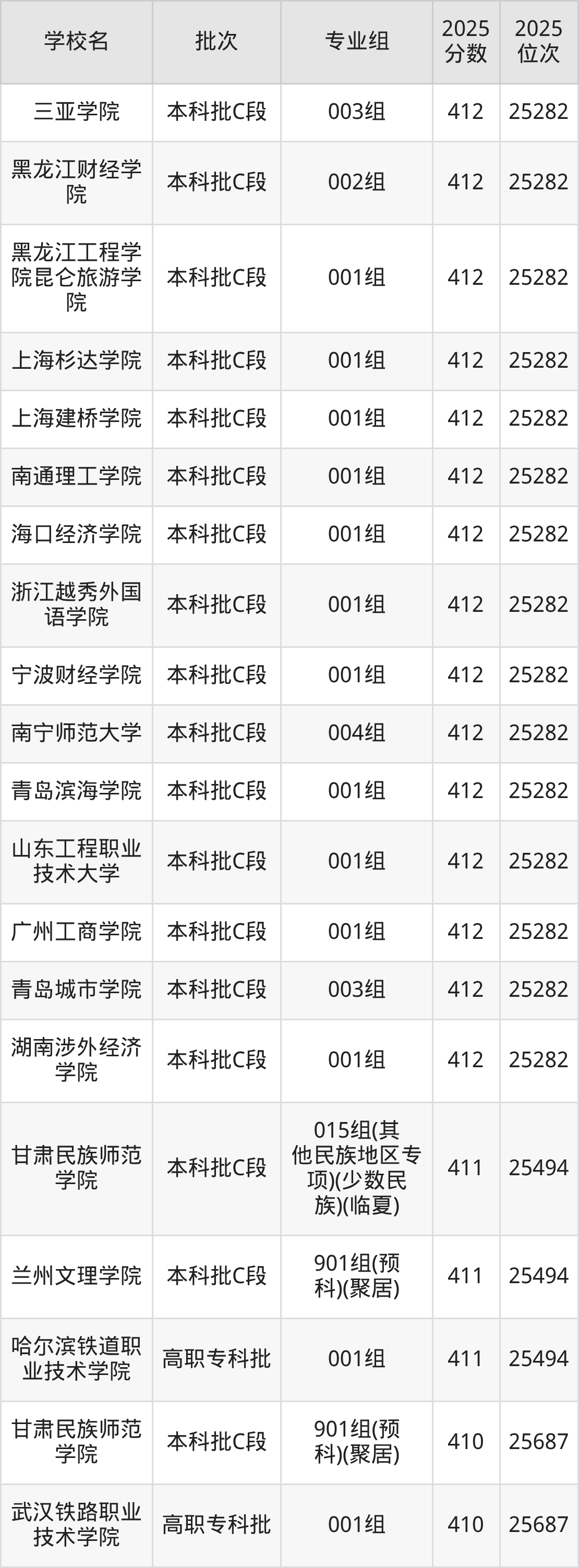 2025年甘肃高考历史类412分(25048名~25282名)能上的大学有北京工业大学耿丹学院001组、天津仁爱学院001组、保定学院001组、鞍山师范学院005组等。