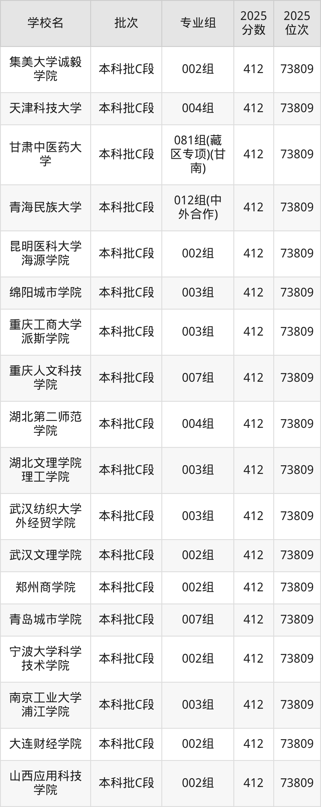 2025年甘肃高考物理类412分(73272名~73809名)能上的大学有天津科技大学004组、山西应用科技学院002组、大连财经学院002组、南京工业大学浦江学院003组等。