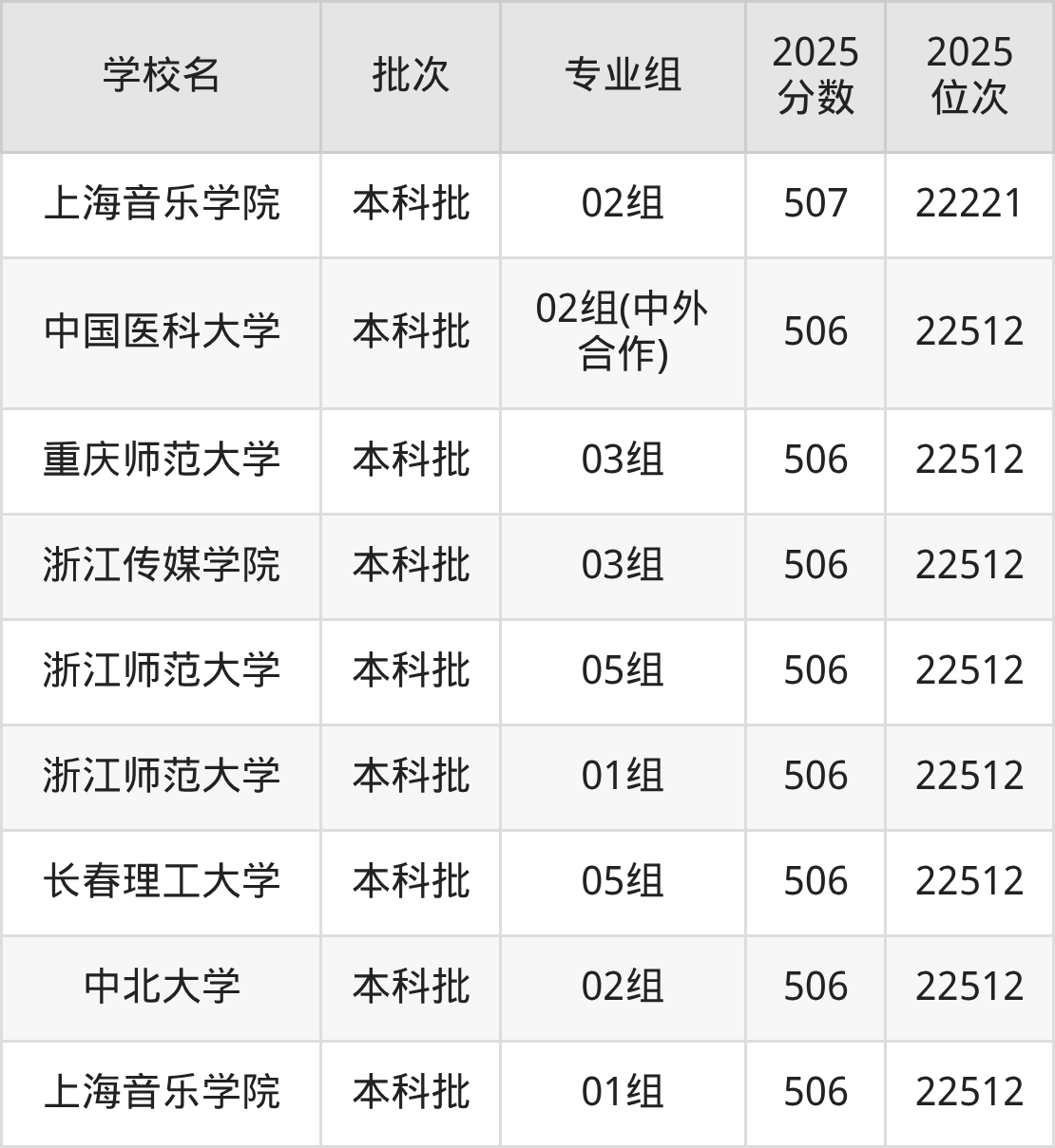 另外录取位次低于该区间(较稳妥)的有中国医科大学02组(中外合作)(22512名)、重庆师范大学03组(22512名)等;录取位次高于该区间(可冲)的有上海应用技术大学03组(21944名)、中国音乐学院01组(21944名)等。
