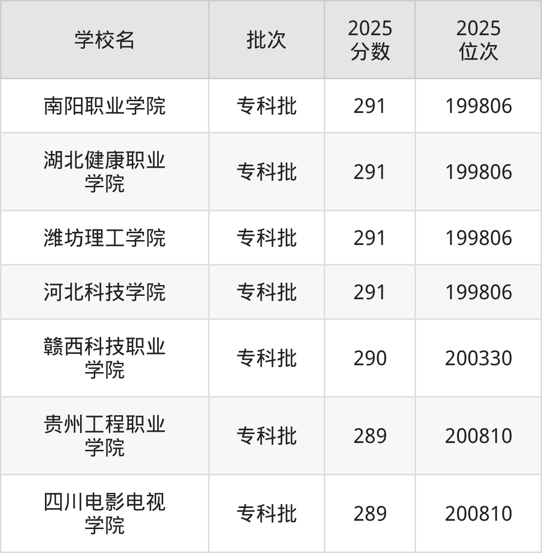 另外录取位次低于该区间(较稳妥)的有四川电影电视学院(200810名)、贵州工程职业学院(200810名)等;录取位次高于该区间(可冲)的有湖北健康职业学院(199806名)、南阳职业学院(199806名)等。