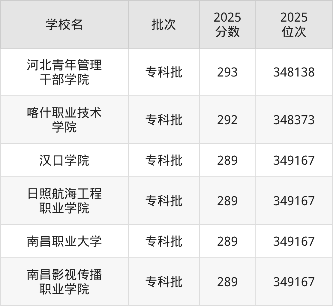 2025年河北高考物理类290分(348626名~348896名)录取位次低于该区间(较稳妥)的有汉口学院(349167名)、日照航海工程职业学院(349167名)等;录取位次高于该区间(可冲)的有喀什职业技术学院(348373名)、河北青年管理干部学院(348138名)等。