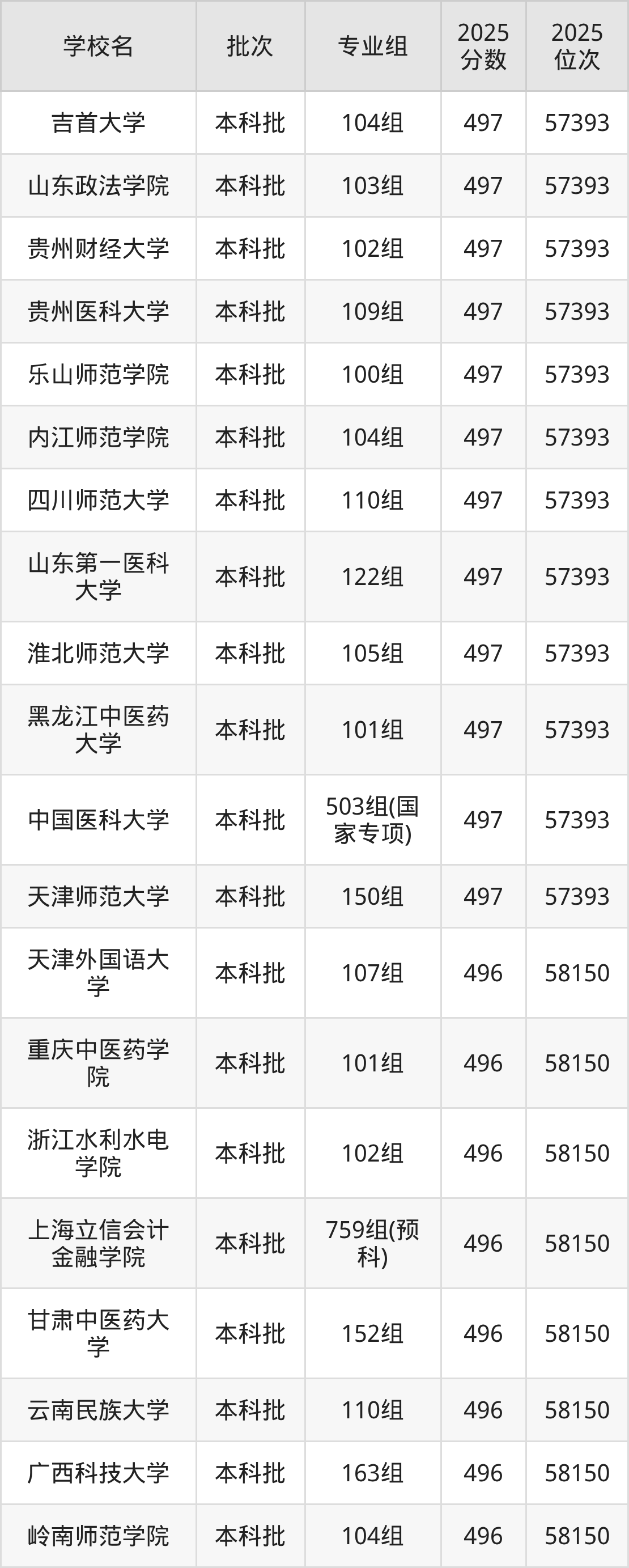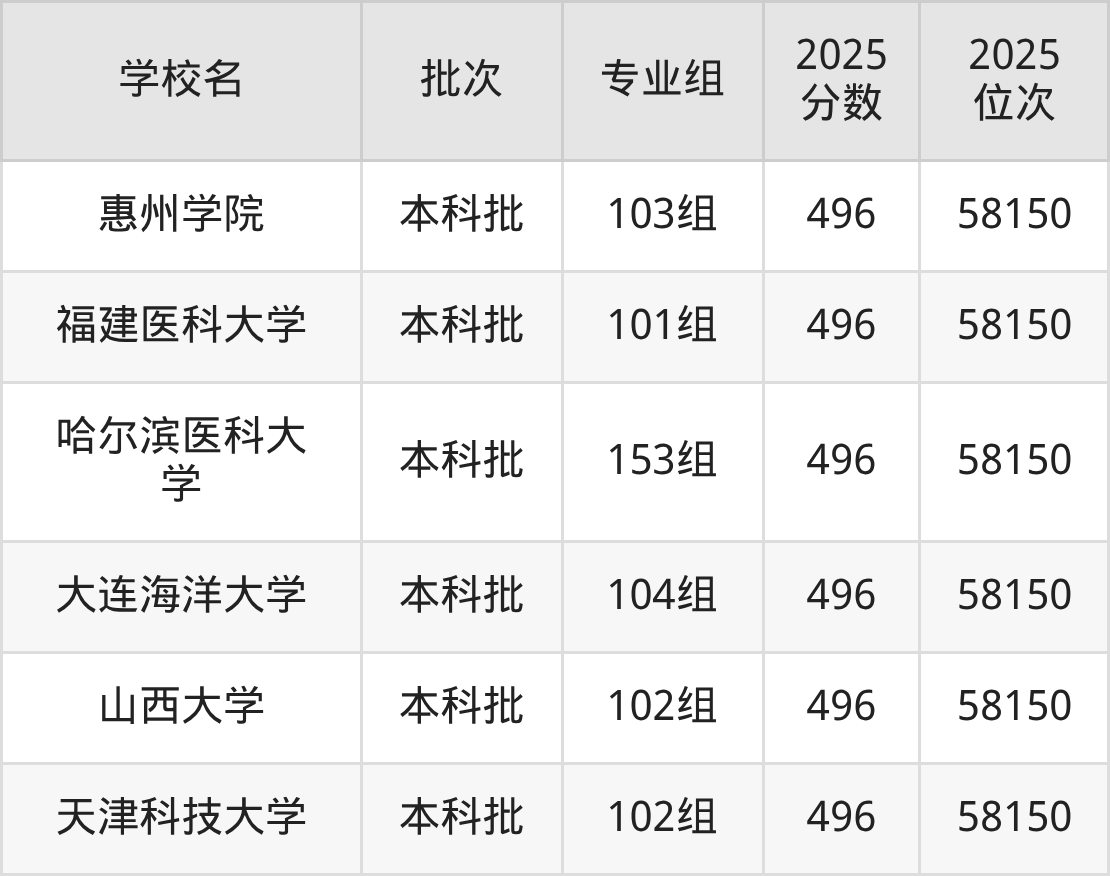 2025年广西高考物理类496分(57394名~58150名)能上的大学有天津科技大学102组、天津外国语大学107组、山西大学102组、大连海洋大学104组等。