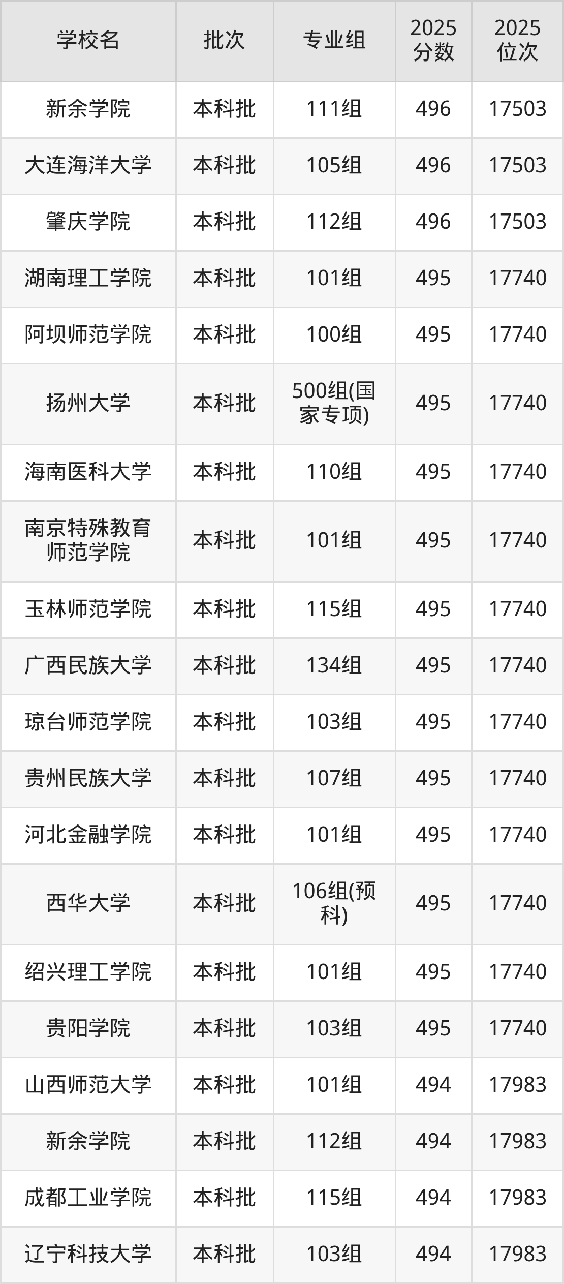 2025年广西高考历史类496分(17217名~17503名)能上的大学有大连海洋大学105组、肇庆学院112组、新余学院111组。