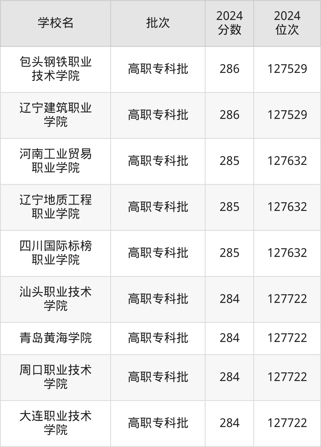 另外录取位次低于该区间(较稳妥)的有广元中核职业技术学院(127323名)、乌海职业技术学院(127423名)等;录取位次高于该区间(可冲)的有江西工程职业学院(127120名)、广西机电职业技术学院(127120名)等。