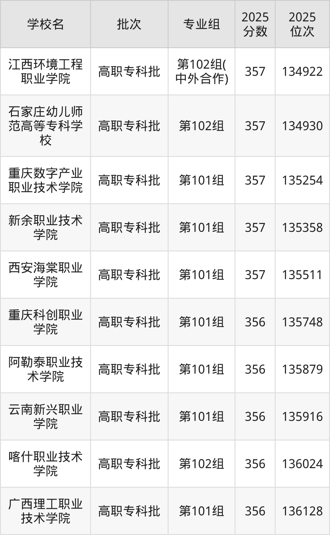 2025年江西高考历史类357分(134896名~135631名)能上的大学有重庆数字产业职业技术学院第101组、西安海棠职业学院第101组、石家庄幼儿师范高等专科学校第102组、江西环境工程职业学院第102组(中外合作)等。