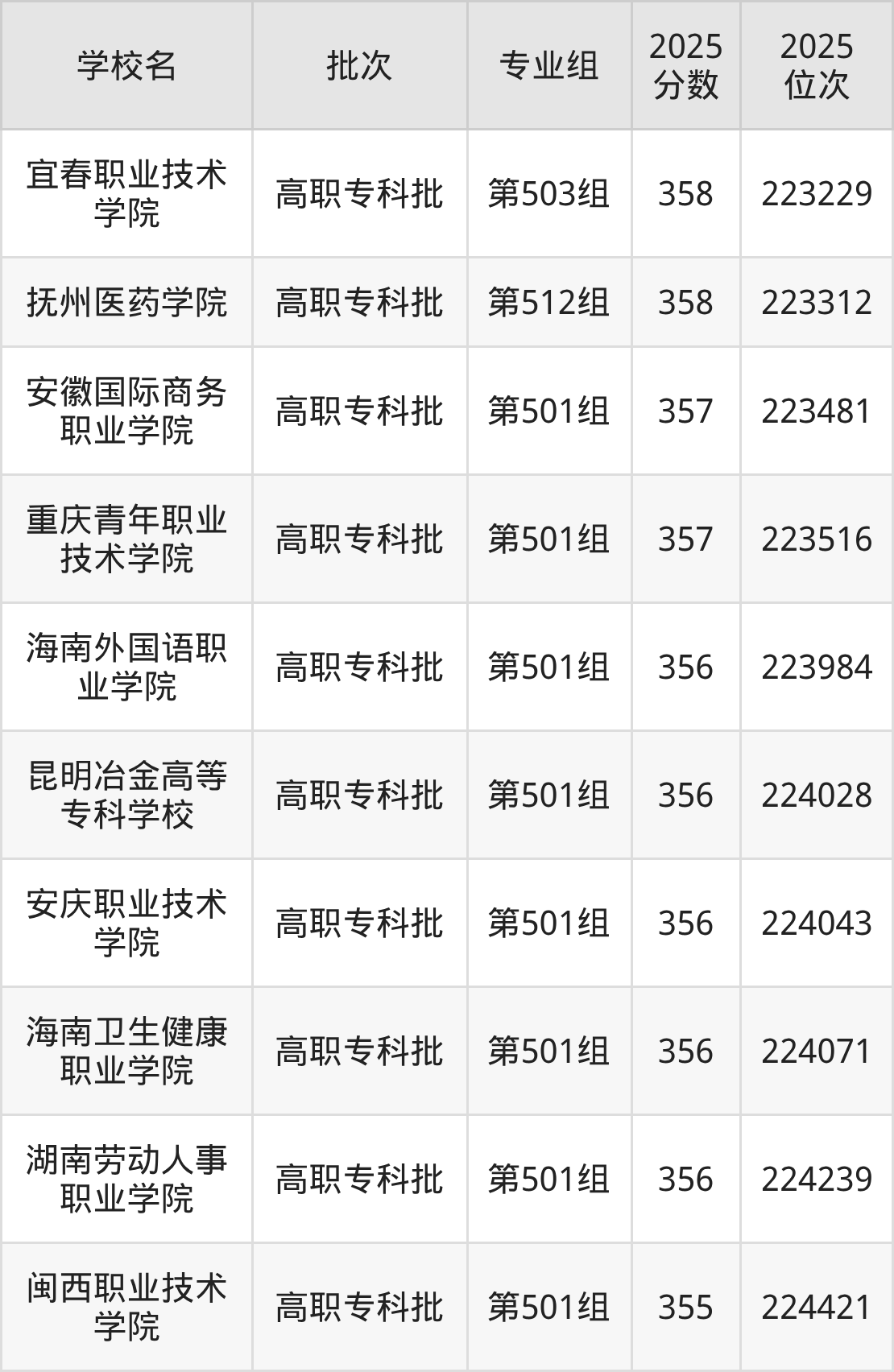 另外录取位次低于该区间(较稳妥)的有海南外国语职业学院第501组(223984名)、昆明冶金高等专科学校第501组(224028名)等;录取位次高于该区间(可冲)的有抚州医药学院第512组(223312名)、宜春职业技术学院第503组(223229名)等。