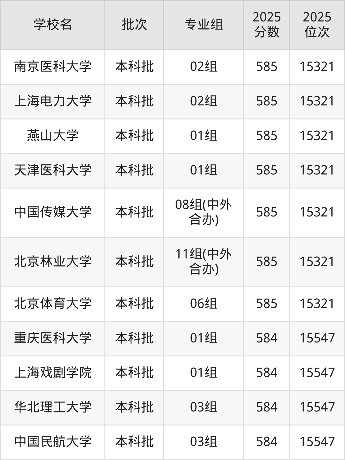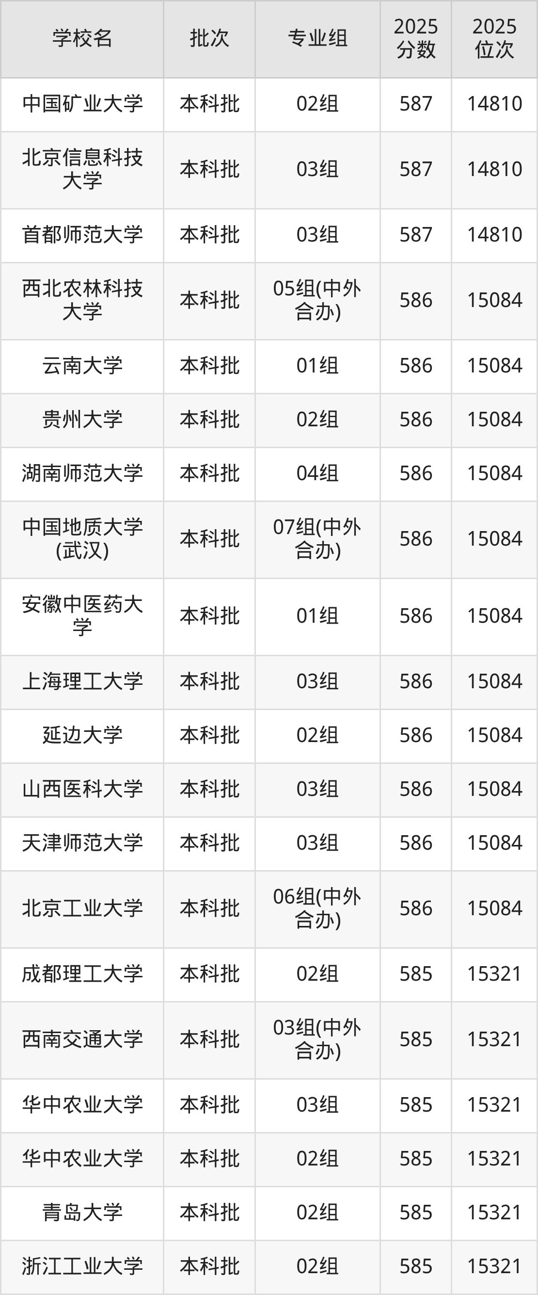 2025年北京高考586分(14811名~15084名)能上的大学有北京工业大学06组(中外合办)、天津师范大学03组、山西医科大学03组、延边大学02组等。