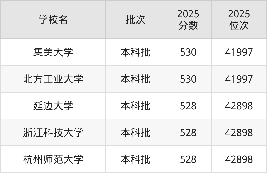 2025年辽宁高考物理类528分(42472名~42898名)能上的大学有杭州师范大学、浙江科技大学、延边大学。