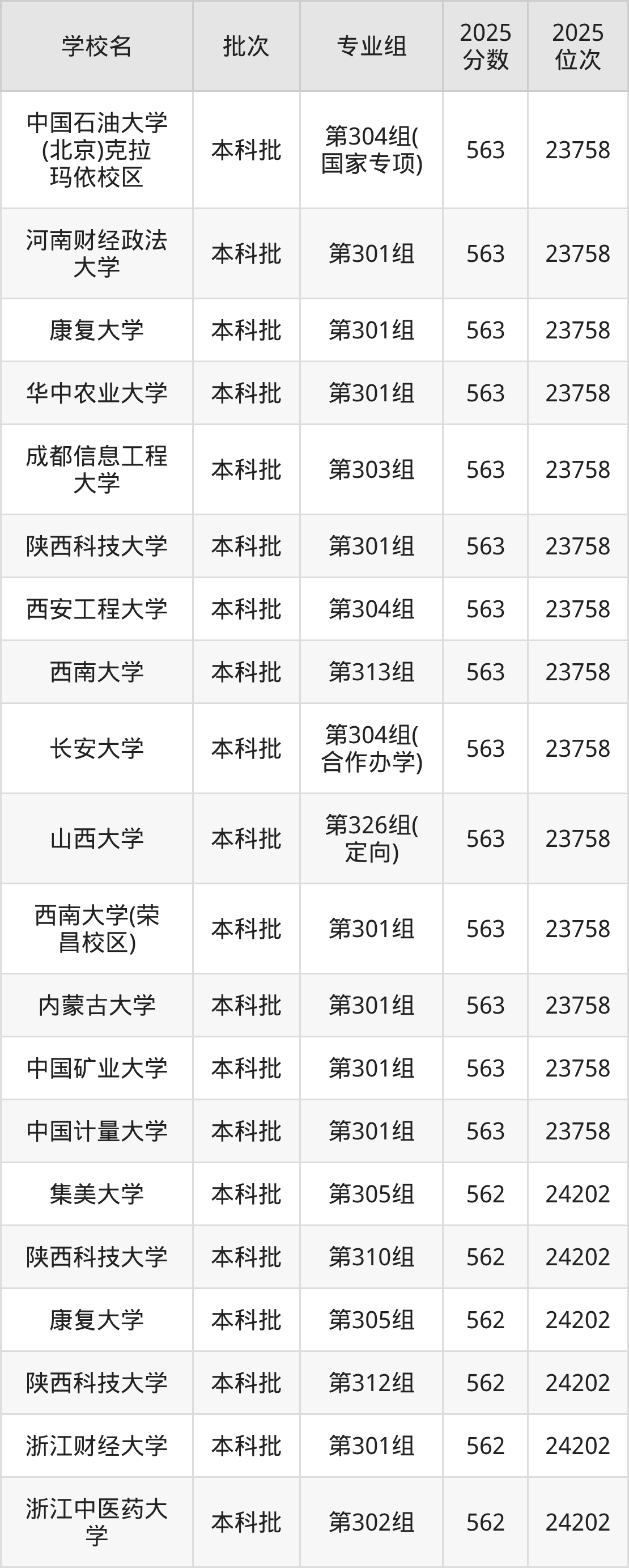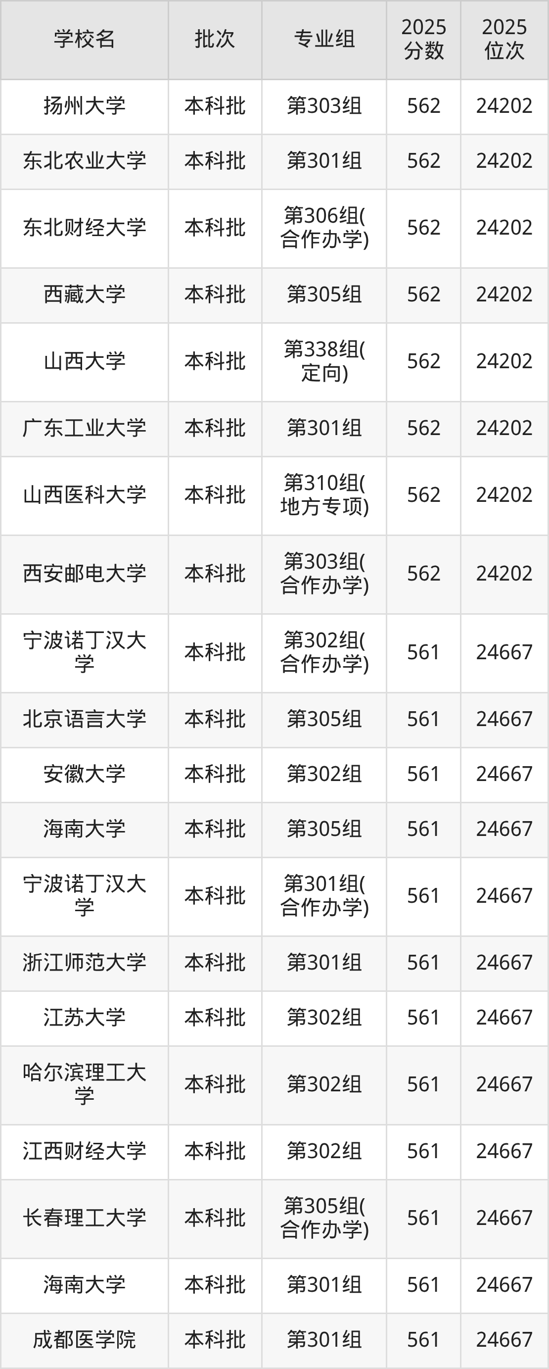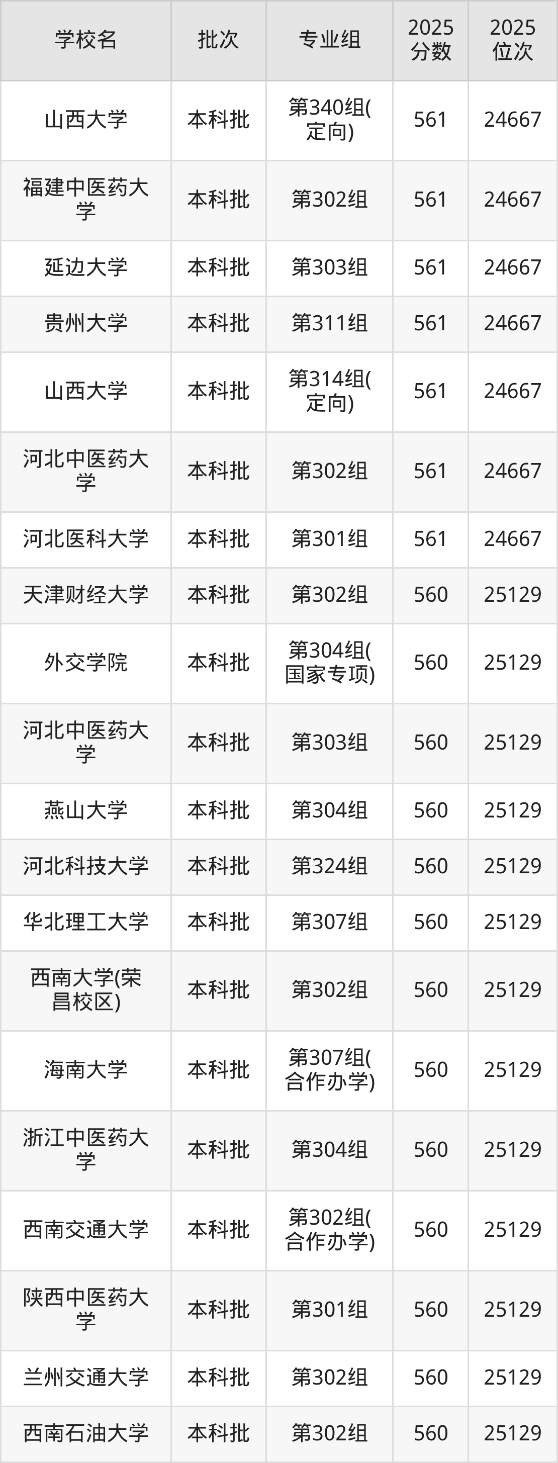 2025年山西高考物理类561分(24203名~24667名)能上的大学有北京语言大学第305组、河北医科大学第301组、河北中医药大学第302组、延边大学第303组等。