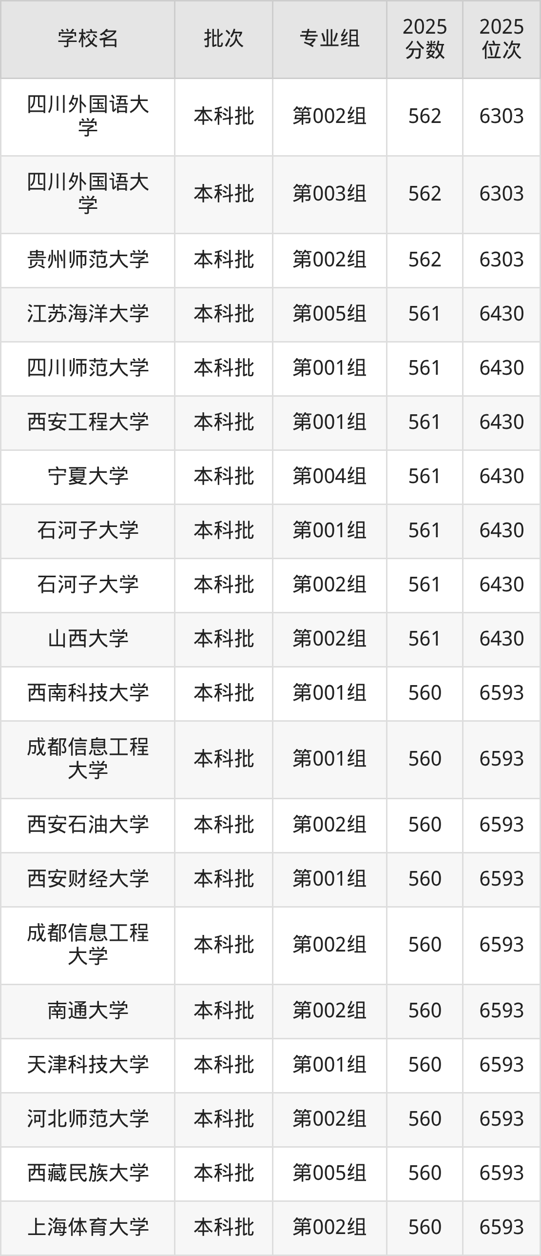 2025年山西高考历史类561分(6304名~6430名)能上的大学有江苏海洋大学第005组、四川师范大学第001组、西安工程大学第001组、宁夏大学第004组等。