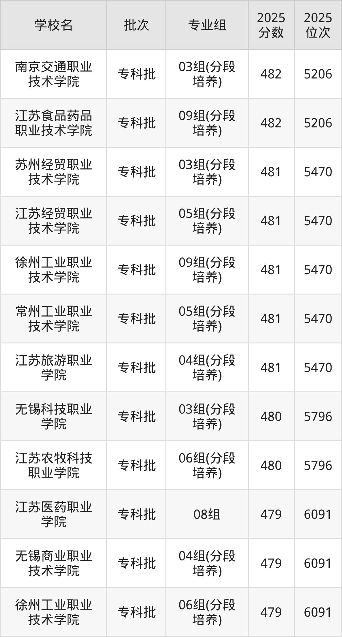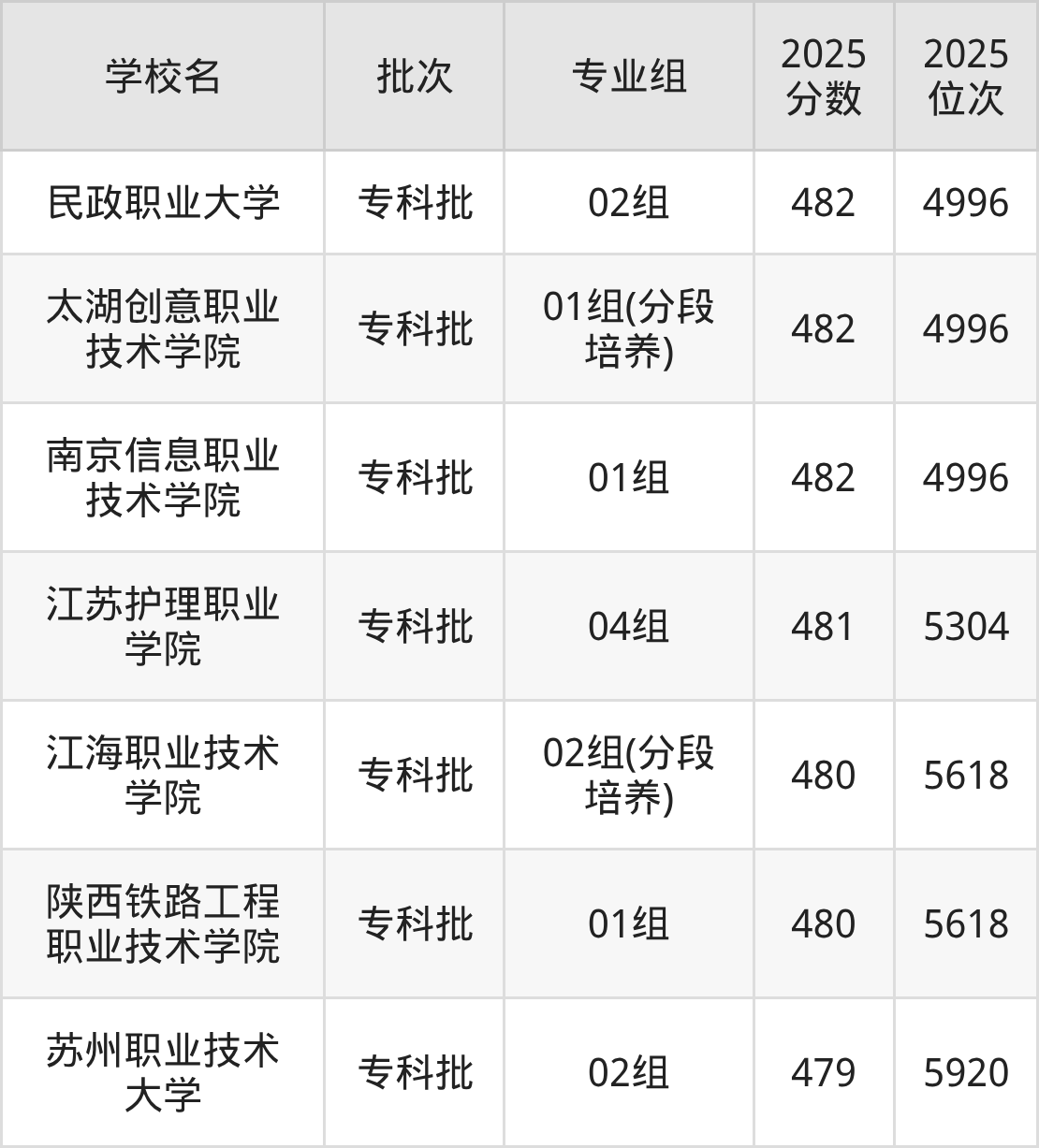 2025年江苏高考历史类480分(5305名~5618名)能上的大学有江海职业技术学院02组(分段培养)、陕西铁路工程职业技术学院01组。