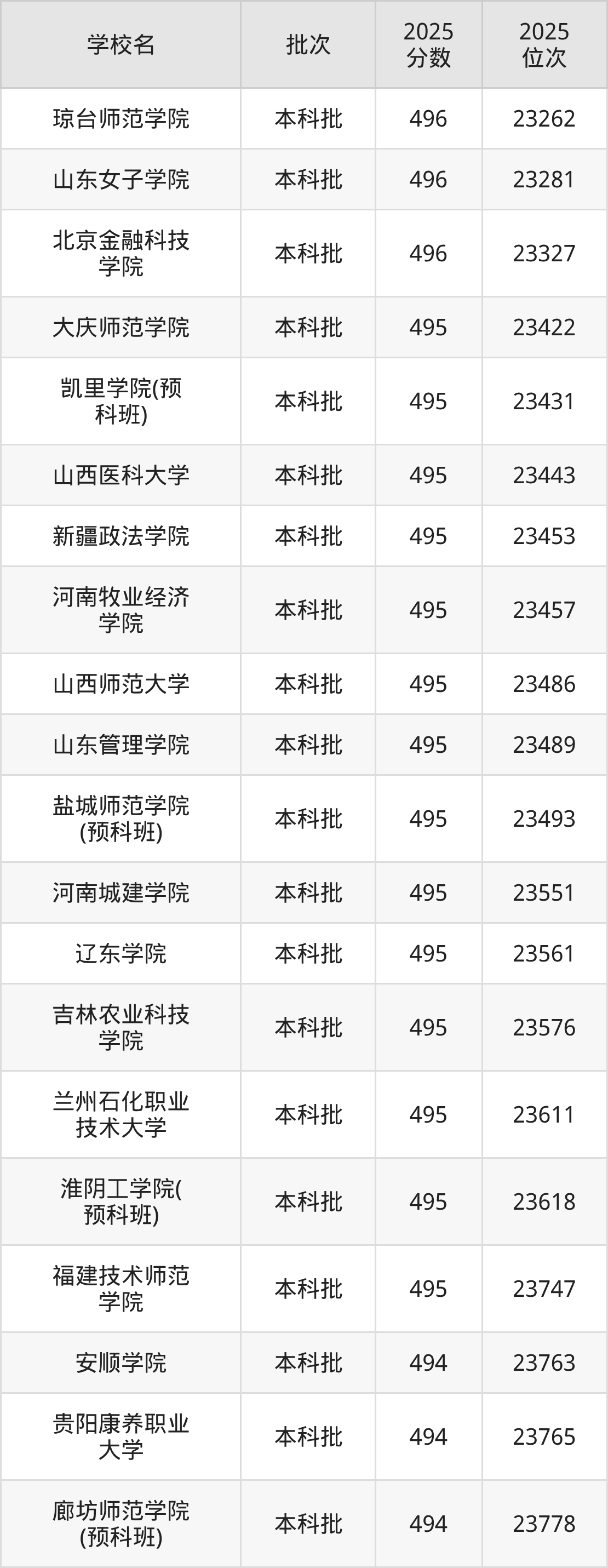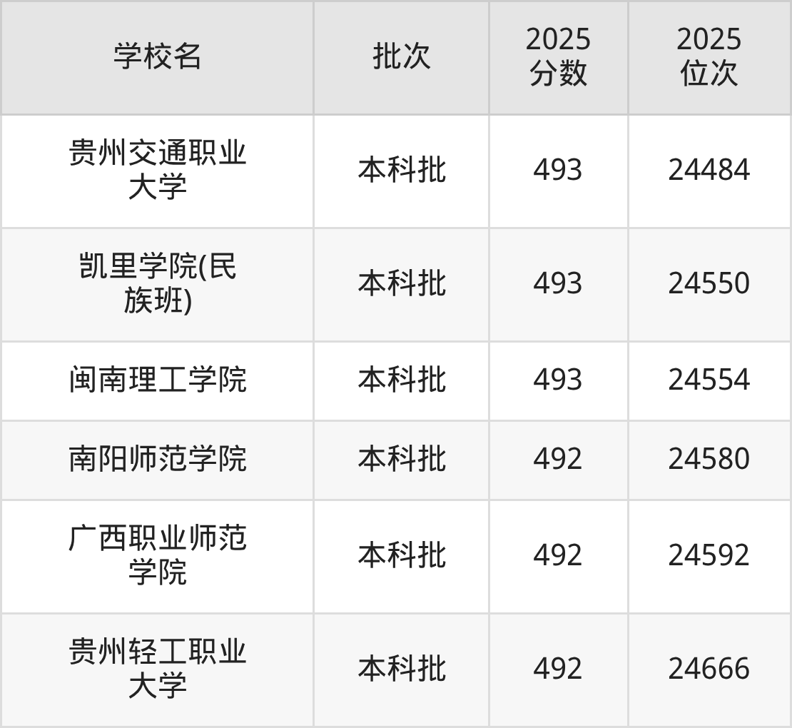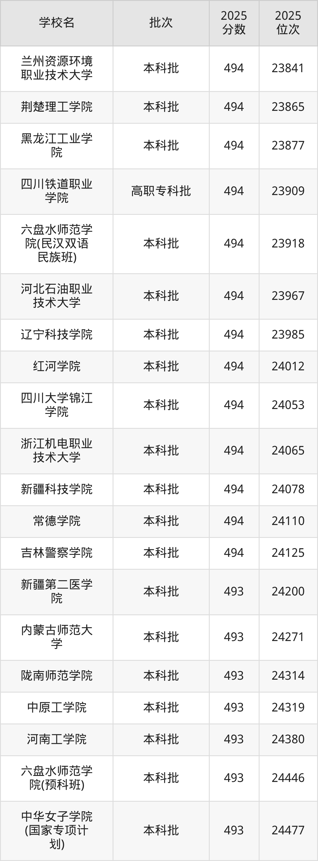 2025年贵州高考历史类494分(23763名~24166名)能上的大学有新疆科技学院、四川大学锦江学院、辽宁科技学院、贵阳康养职业大学等。