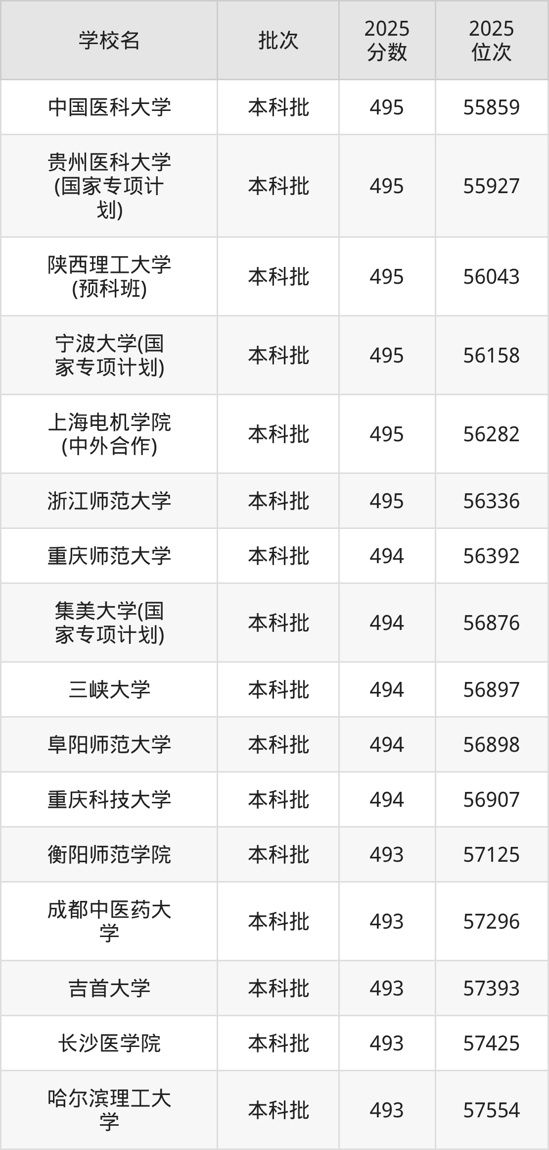 2025年贵州高考物理类494分(56345名~57118名)能上的大学有重庆师范大学、重庆科技大学、阜阳师范大学、三峡大学等。