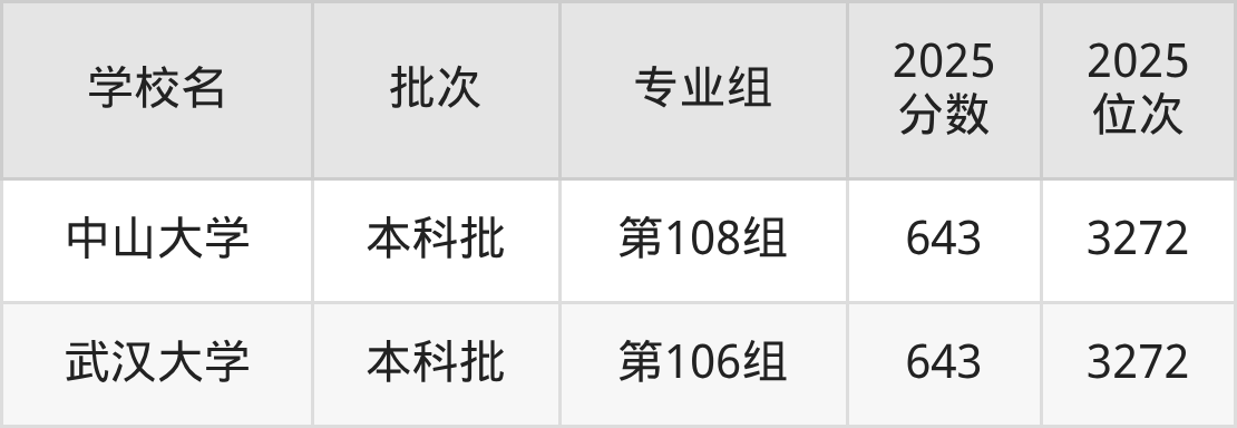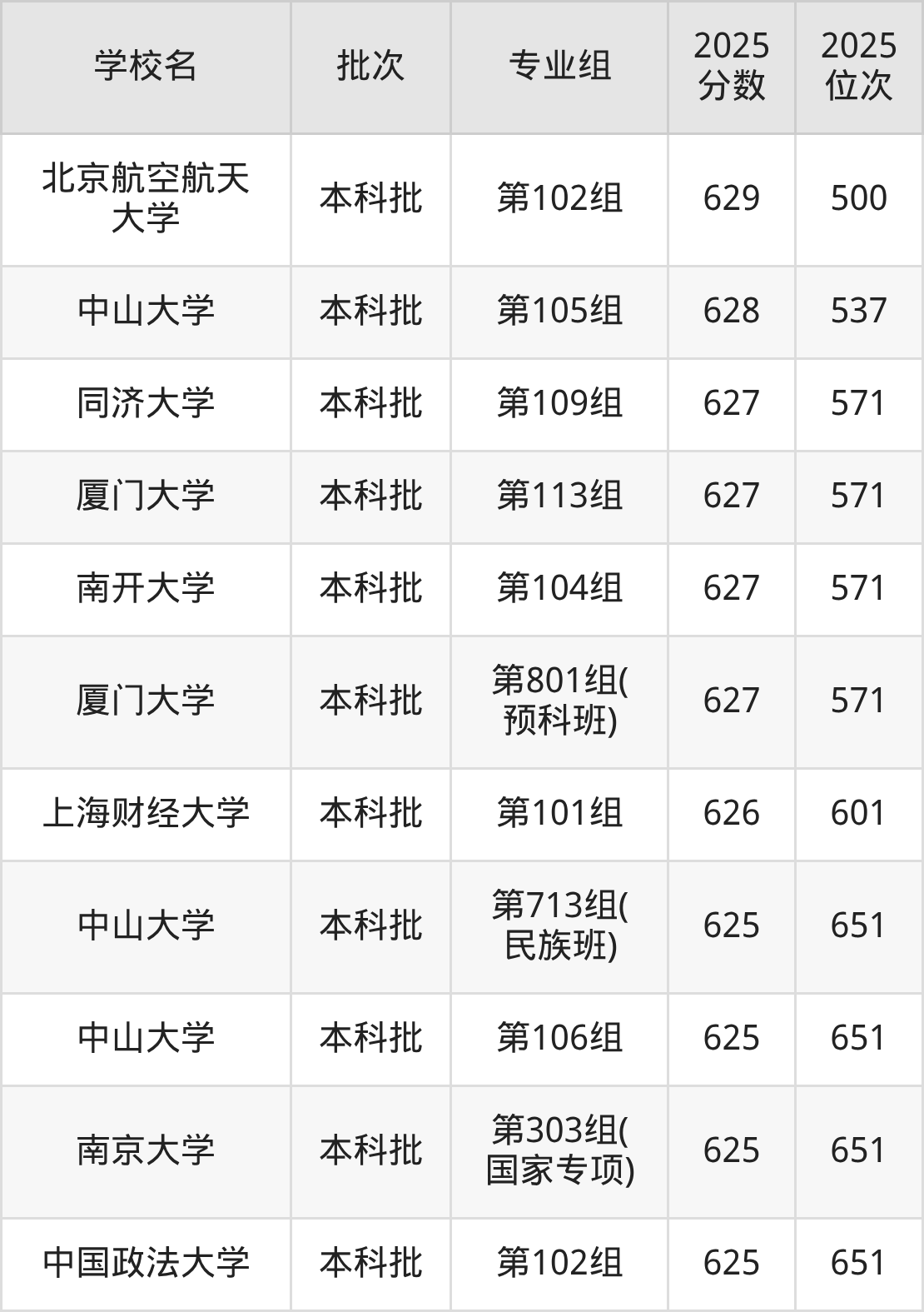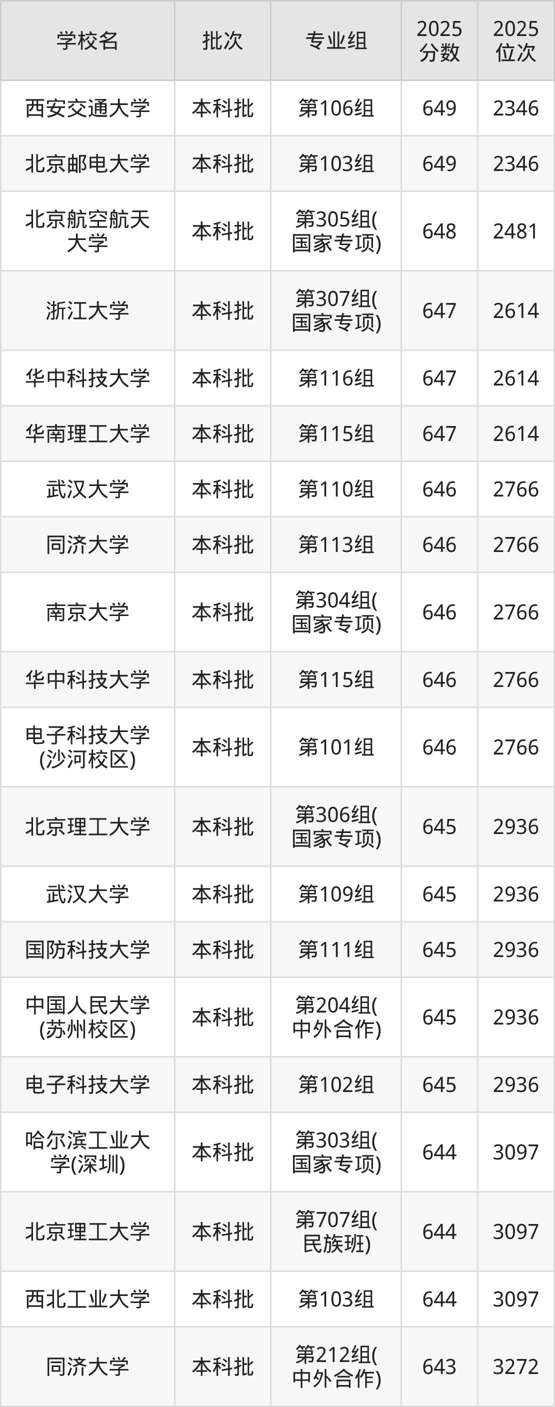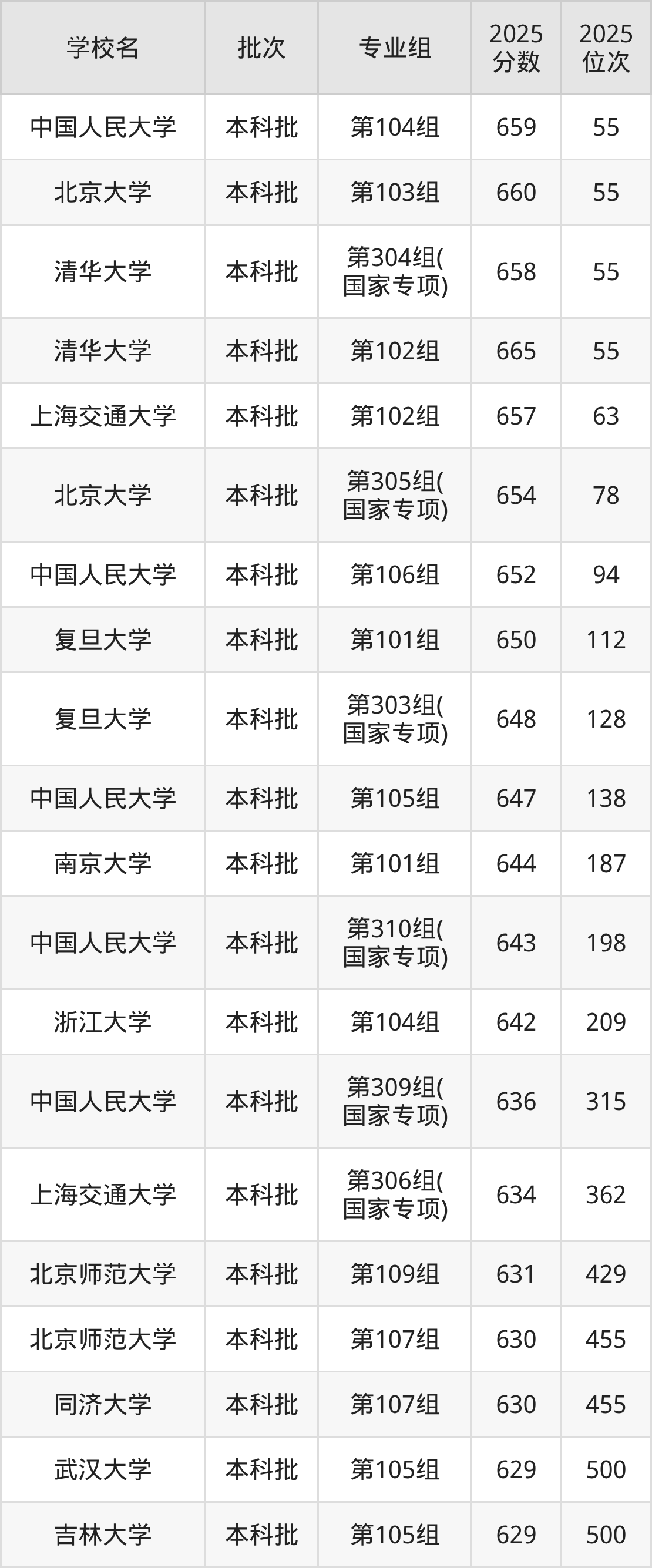 2025年湖南高考历史类645分(154名~172名)录取位次低于该区间(较稳妥)的有南京大学第101组(187名)、中国人民大学第310组(国家专项)(198名)等;录取位次高于该区间(可冲)的有中国人民大学第105组(138名)、复旦大学第303组(国家专项)(128名)等。