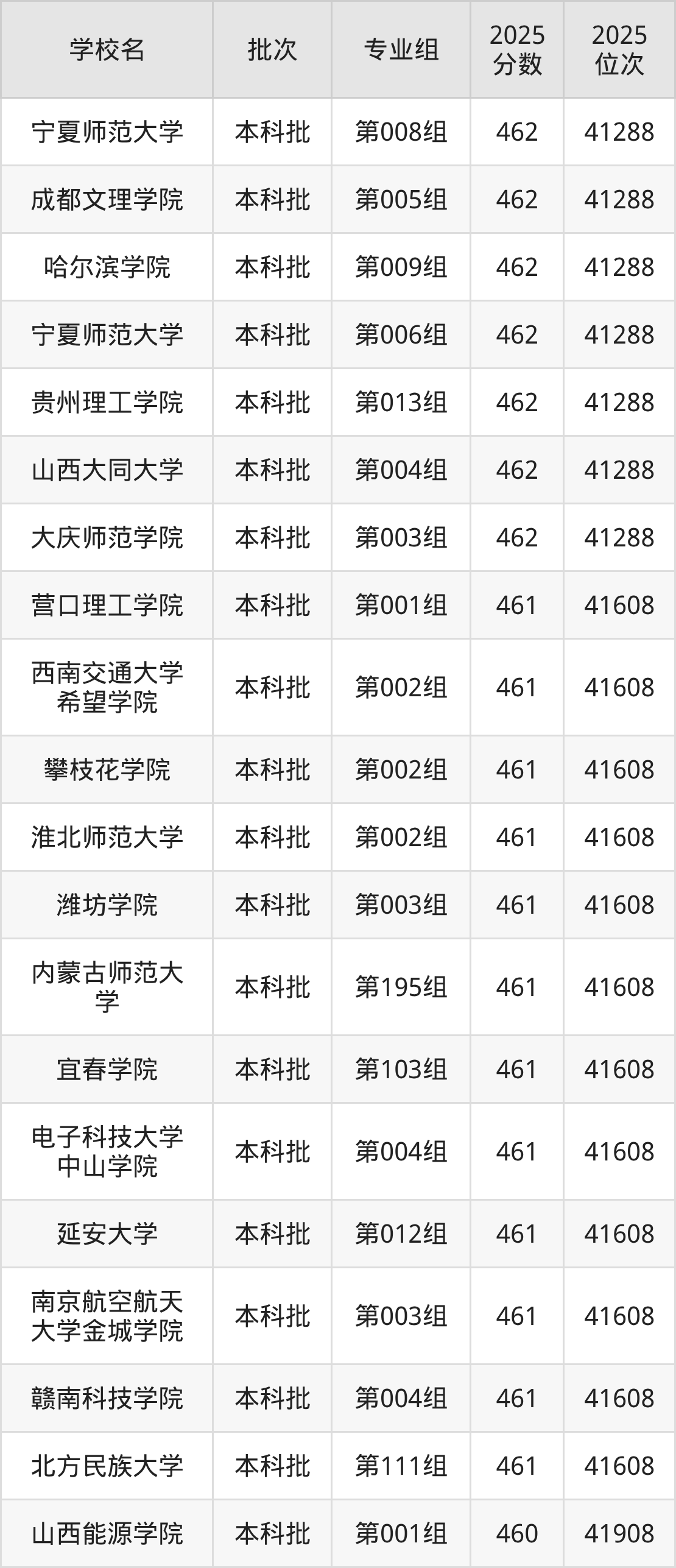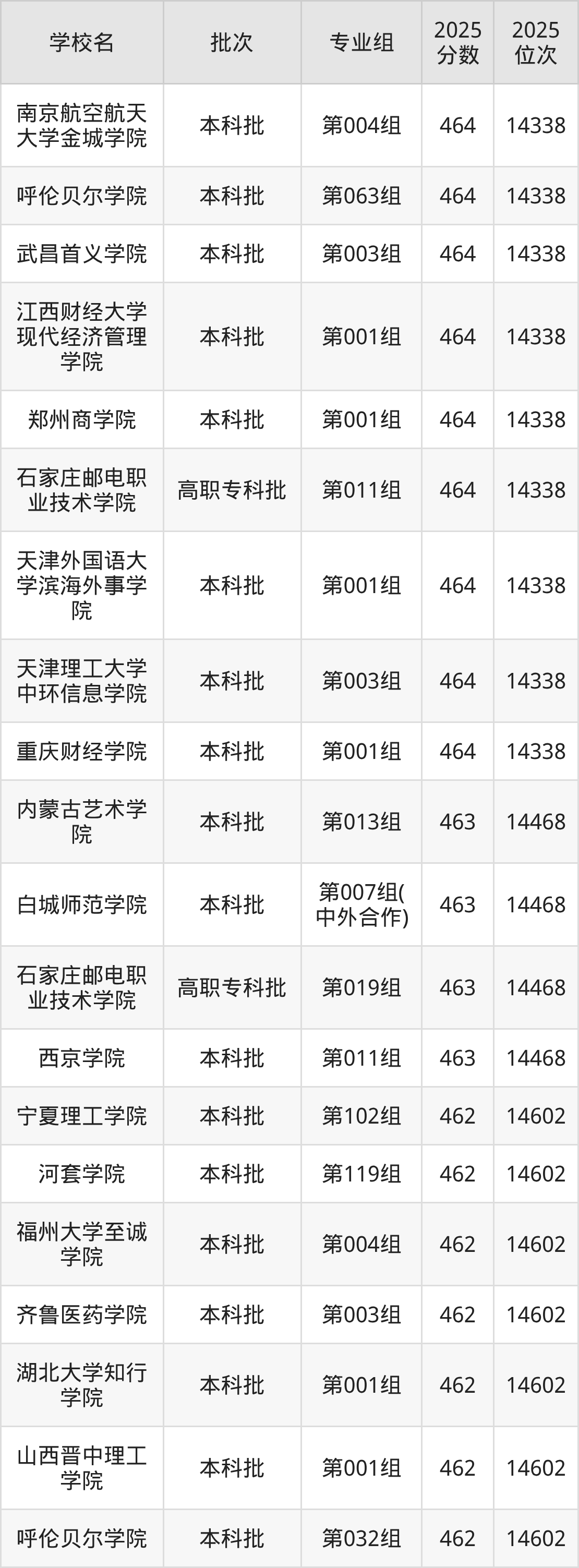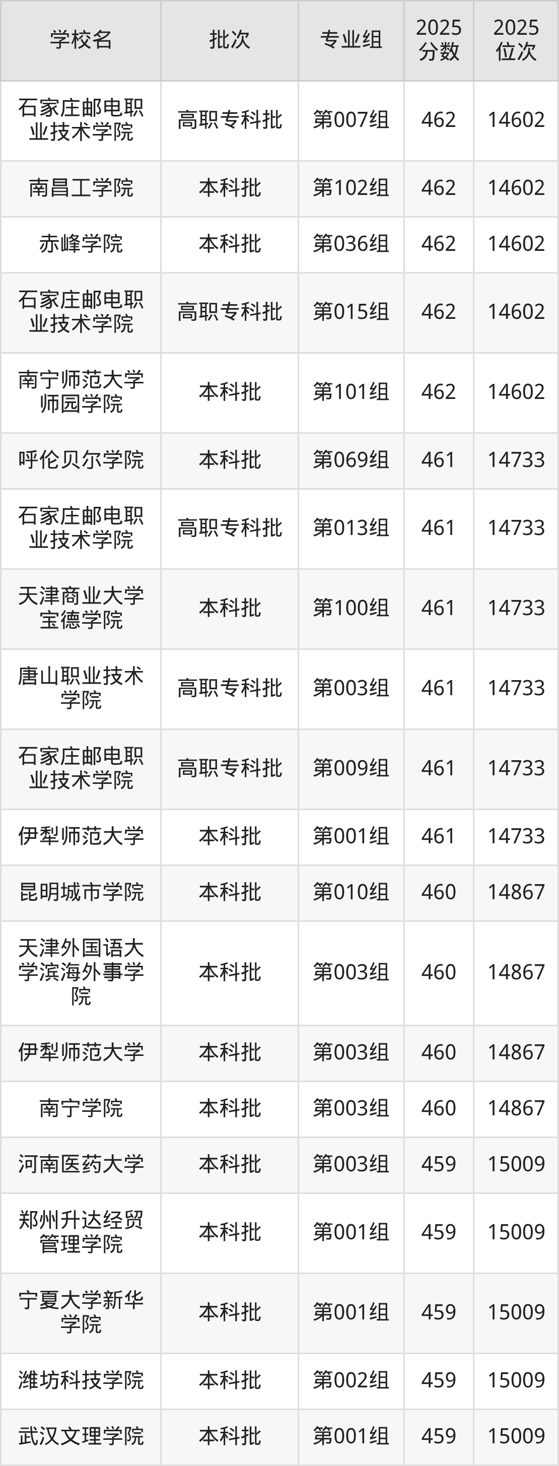 2025年内蒙古高考历史类460分(14734名~14867名)能上的大学有伊犁师范大学第003组、南宁学院第003组、天津外国语大学滨海外事学院第003组、昆明城市学院第010组。