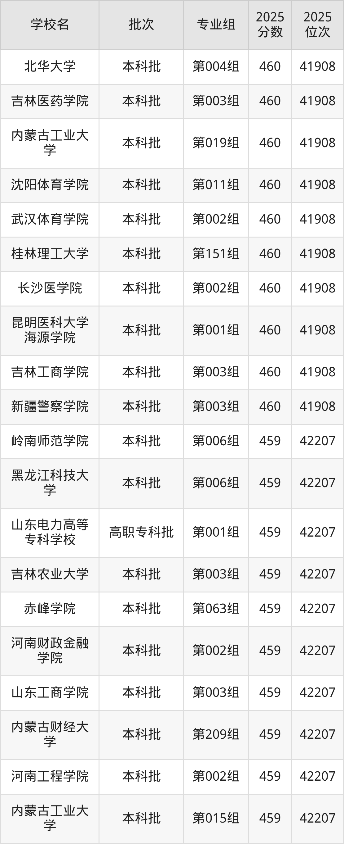 2025年内蒙古高考物理类460分(41609名~41908名)能上的大学有新疆警察学院第003组、吉林工商学院第003组、昆明医科大学海源学院第001组、长沙医学院第002组等。