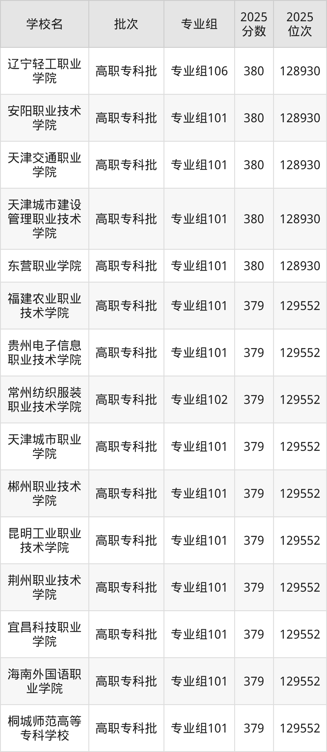 2025年四川高考历史类379分(128931名~129552名)能上的大学有郴州职业技术学院专业组101、天津城市职业学院专业组101、常州纺织服装职业技术学院专业组102、昆明工业职业技术学院专业组101等。
