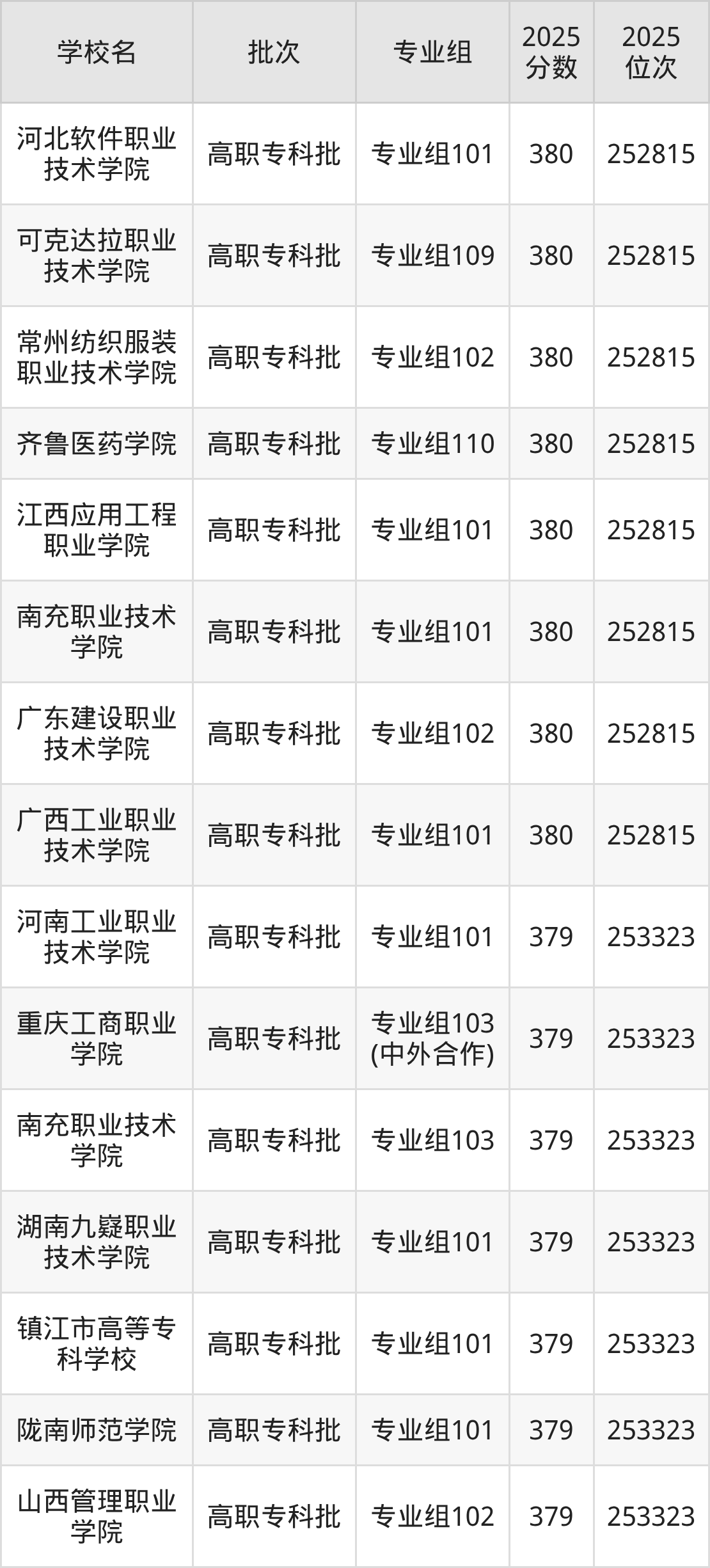 2025年四川高考物理类379分(252816名~253323名)能上的大学有河南工业职业技术学院专业组101、山西管理职业学院专业组102、陇南师范学院专业组101、镇江市高等专科学校专业组101等。
