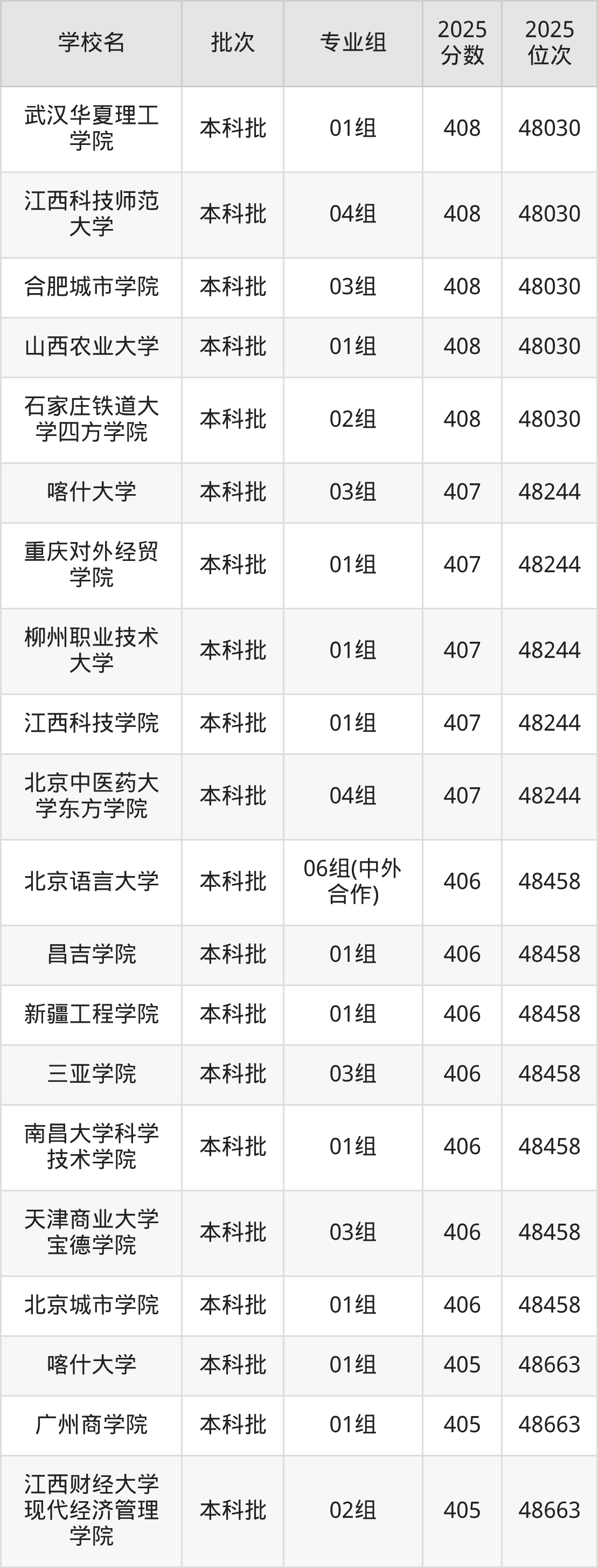 2025年上海高考407分(48031名~48244名)能上的大学有北京中医药大学东方学院04组、江西科技学院01组、柳州职业技术大学01组、重庆对外经贸学院01组等。