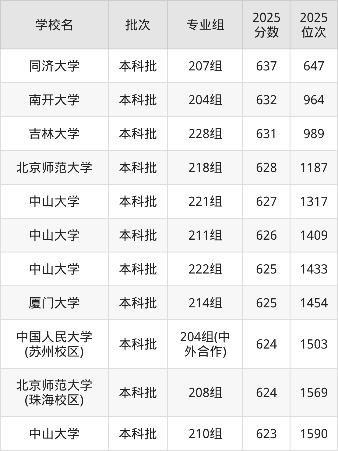 2025年广东高考历史类630分(1017名~1107名)录取位次低于该区间(较稳妥)的有北京师范大学218组(1187名)、中山大学221组(1317名)等;录取位次高于该区间(可冲)的有吉林大学228组(989名)、南开大学204组(964名)等。