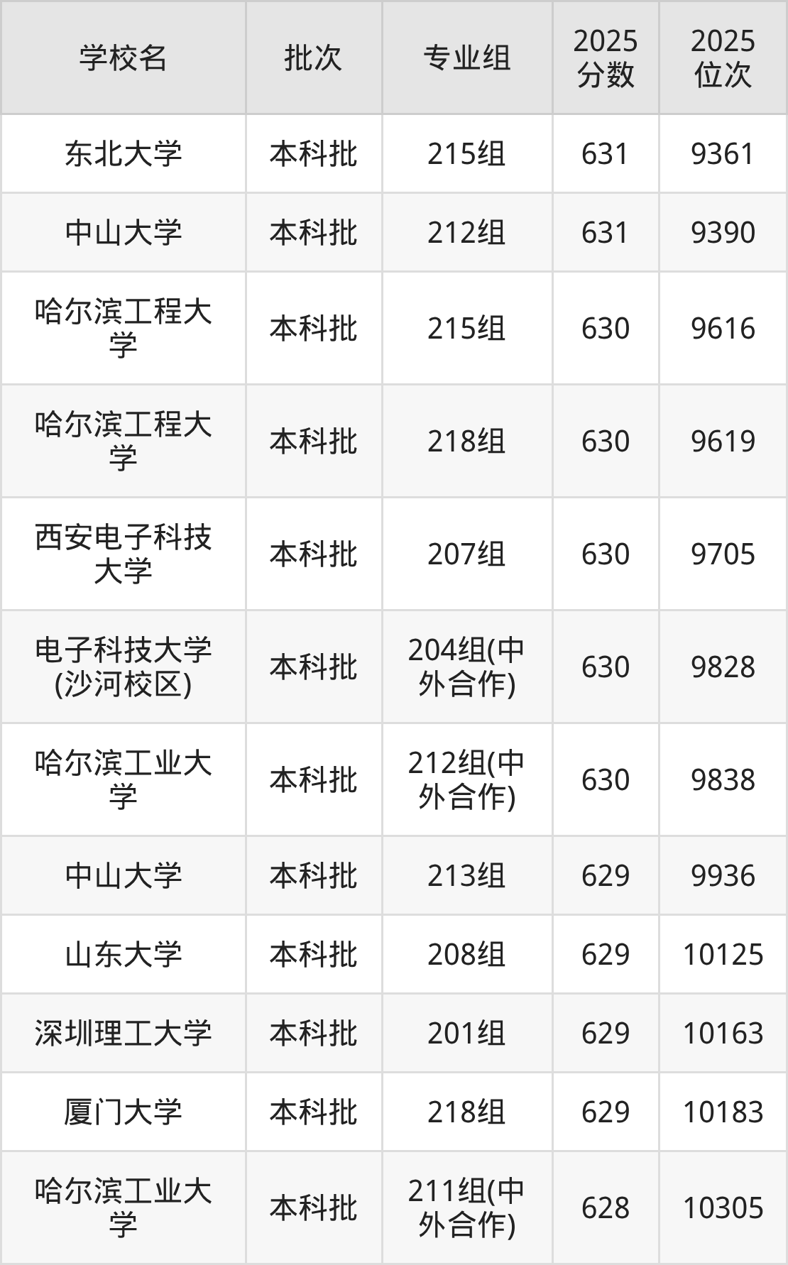 2025年广东高考物理类630分(9475名~9850名)能上的大学有哈尔滨工业大学212组(中外合作)、哈尔滨工程大学215组、哈尔滨工程大学218组、西安电子科技大学207组等。