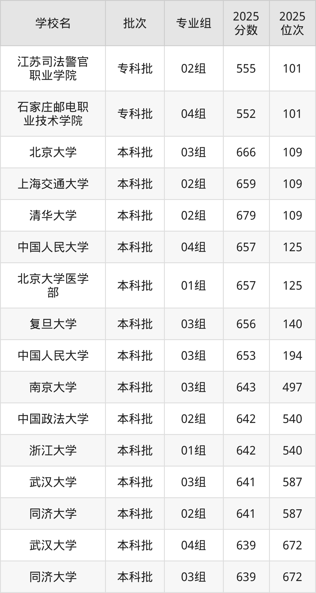 2025年江苏高考历史类652分(195名~214名)录取位次低于该区间(较稳妥)的有石家庄邮电职业技术学院04组(101名)、江苏司法警官职业学院02组(101名)等;录取位次高于该区间(可冲)的有中国人民大学03组(194名)、复旦大学03组(140名)等。