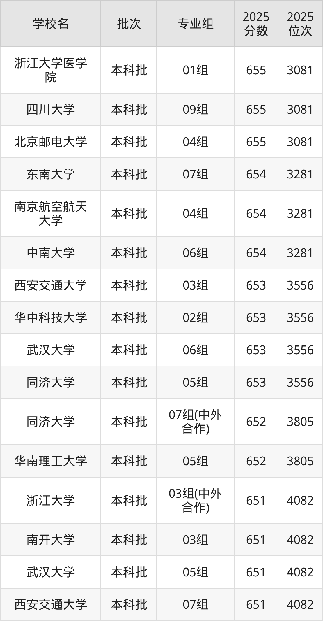 2025年江苏高考物理类652分(3557名~3805名)能上的大学有同济大学07组(中外合作)、华南理工大学05组。