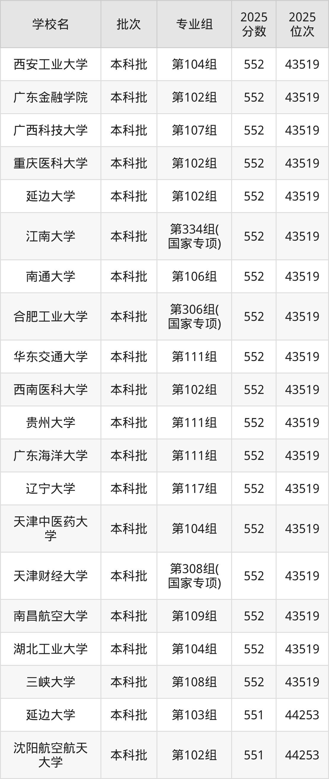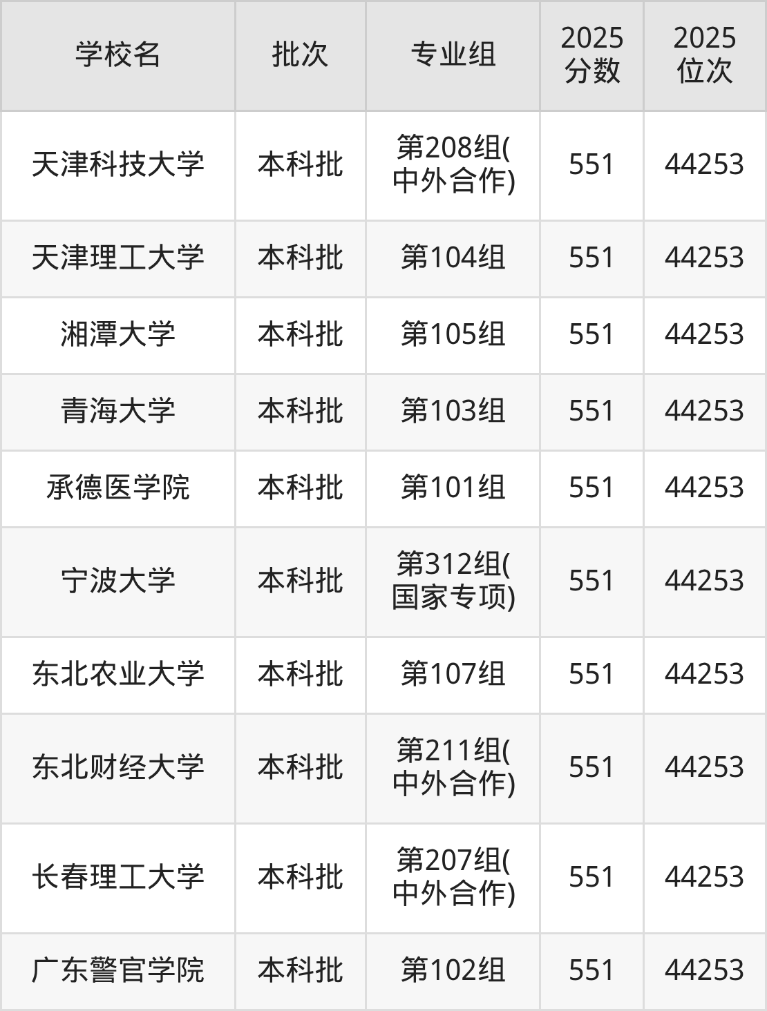 2025年湖南高考物理类551分(43520名~44253名)能上的大学有天津理工大学第104组、天津科技大学第208组(中外合作)、承德医学院第101组、东北财经大学第211组(中外合作)等。