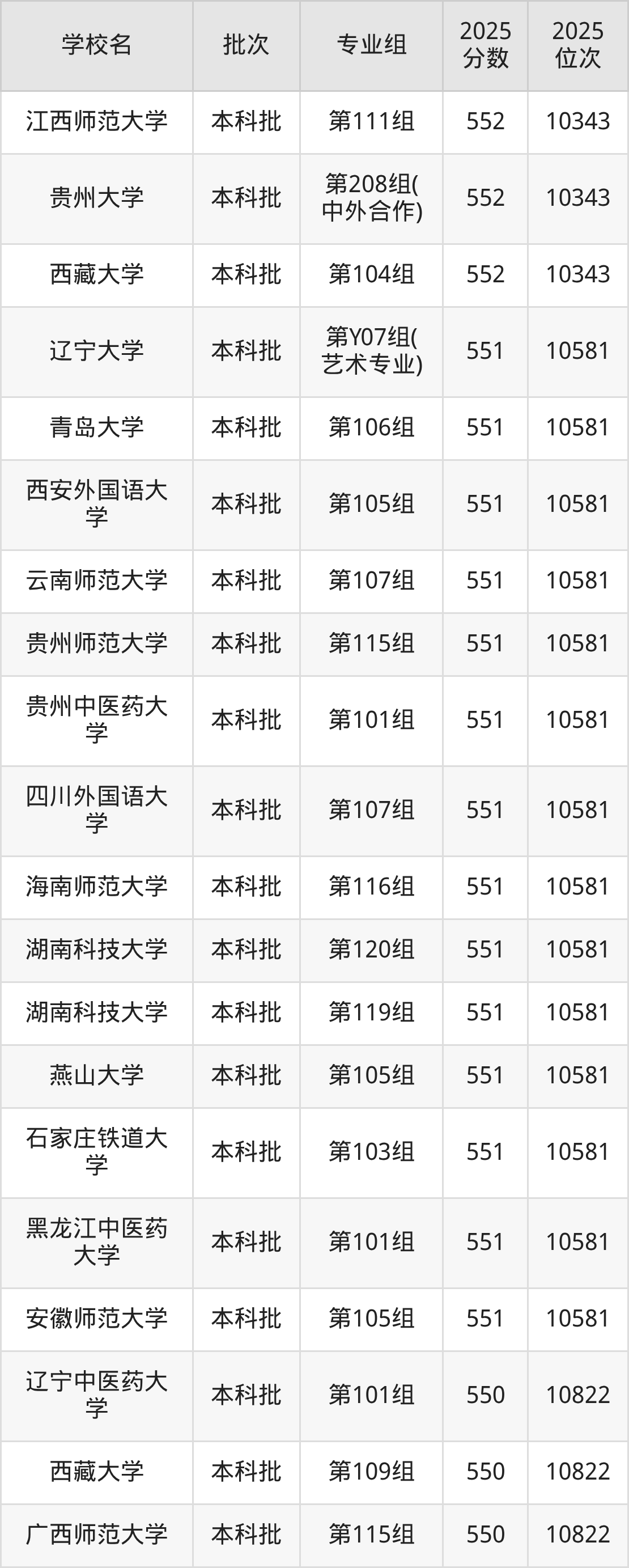 2025年湖南高考历史类551分(10344名~10581名)能上的大学有燕山大学第105组、石家庄铁道大学第103组、黑龙江中医药大学第101组、安徽师范大学第105组等。
