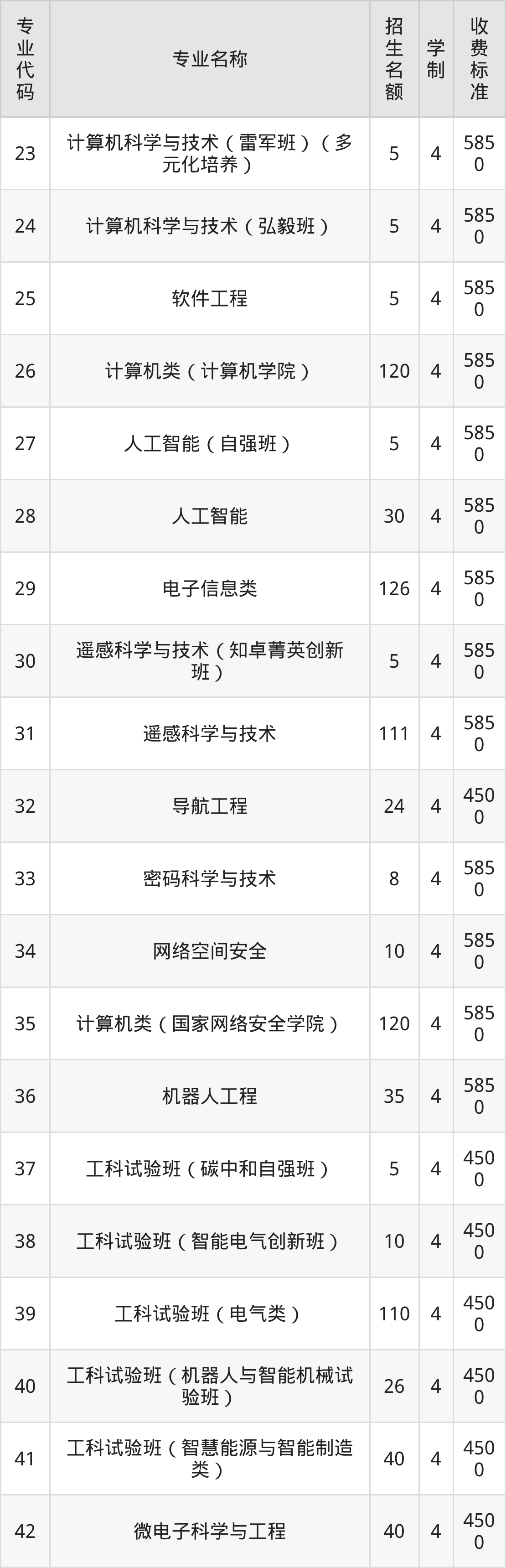 根据湖北高考2025年招生计划可知,武汉大学本科批物理类共招1216位学生,学费最低是4500元一年,招生专业包含:计算机科学与技术、软件工程、计算机类、人工智能、电子信息类等。