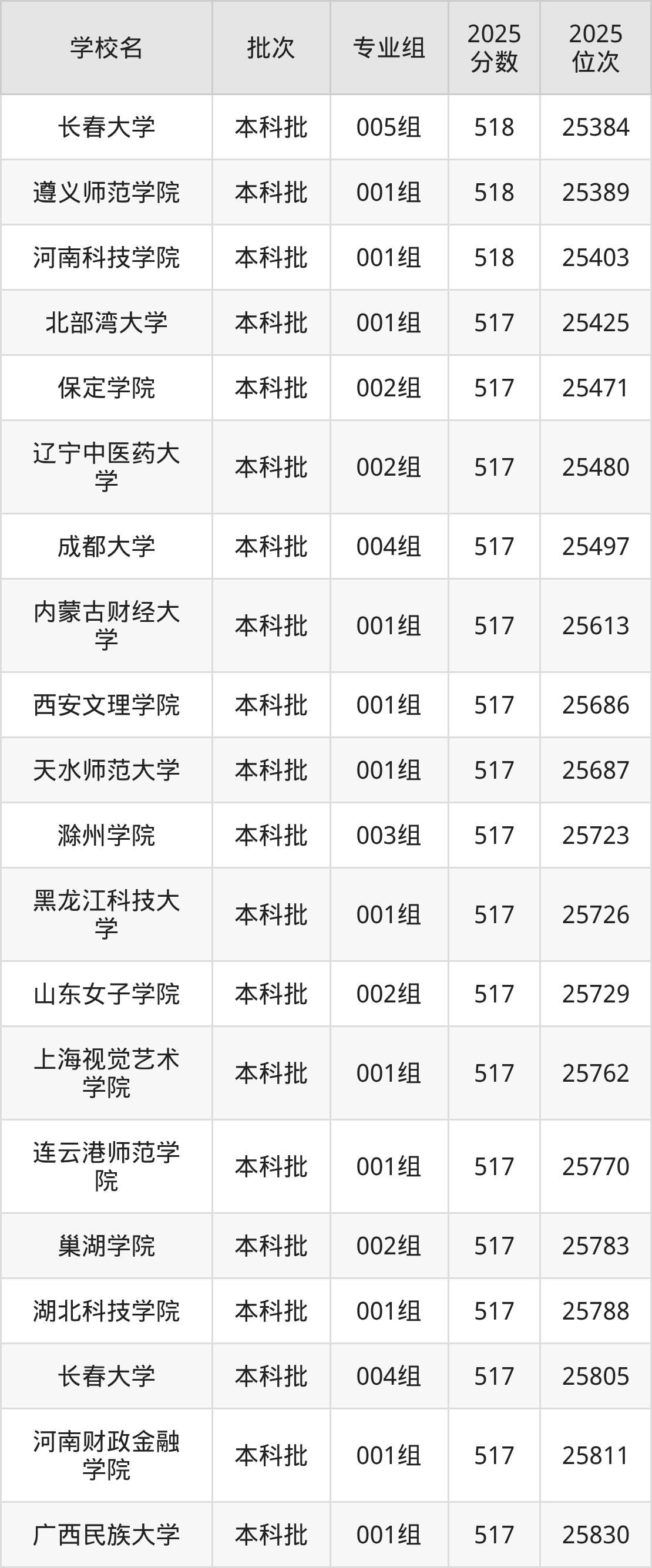 另外录取位次低于该区间(较稳妥)的有吉林农业大学001组(26294名)、山东管理学院001组(26378名)等;录取位次高于该区间(可冲)的有广西民族大学001组(25830名)、河南财政金融学院001组(25811名)等。