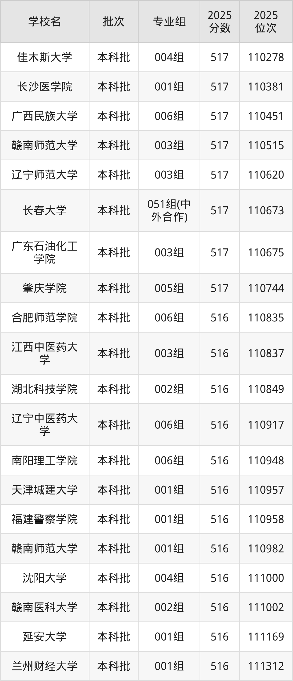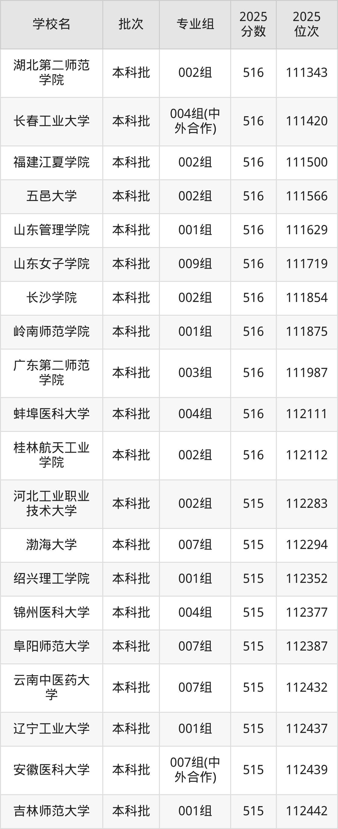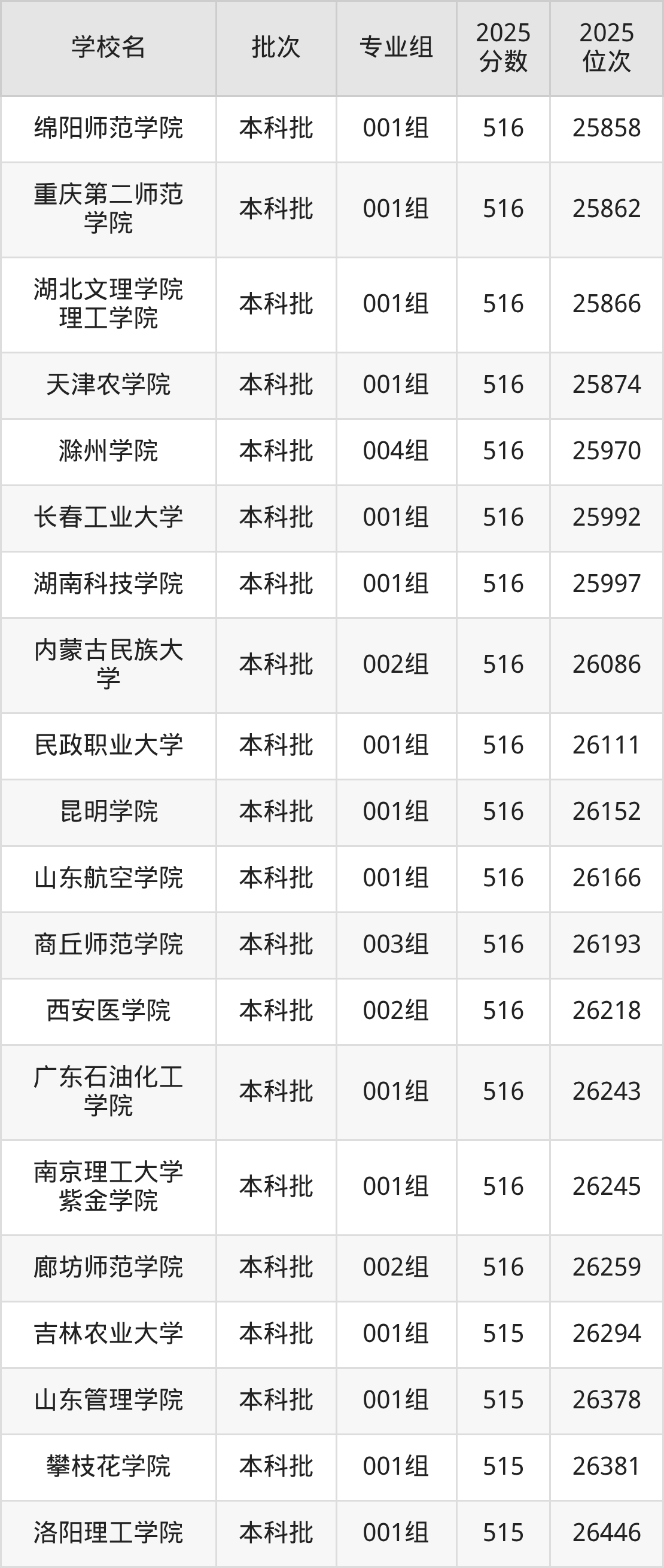 2025年安徽高考历史类516分(25853名~26278名)能上的大学有长春工业大学001组、重庆第二师范学院001组、广东石油化工学院001组、湖南科技学院001组等。