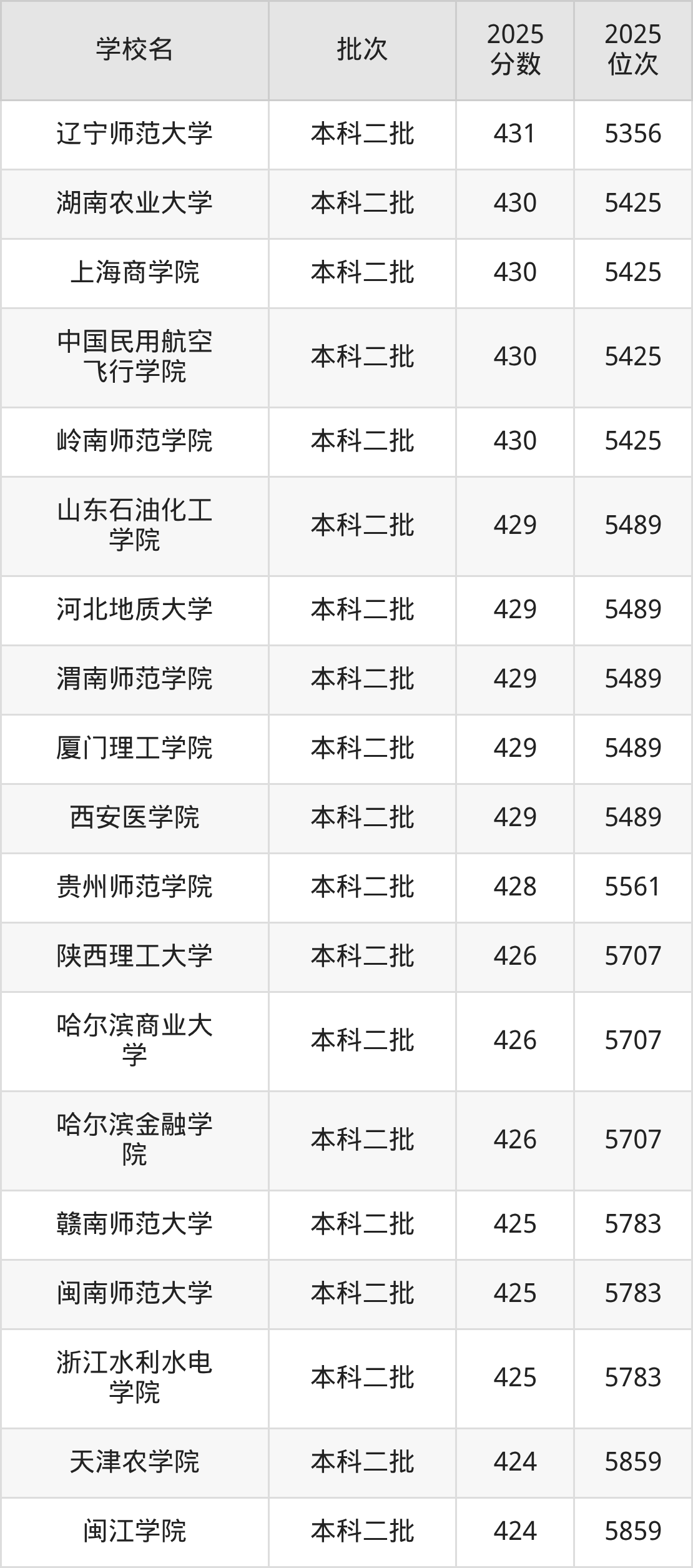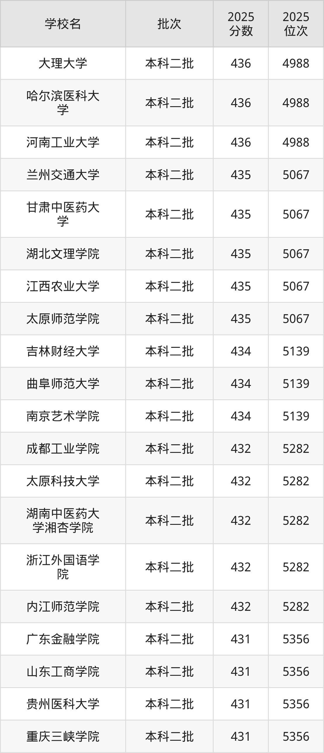 这些都是2026年高考文科5357名~5425名考生可以报考的大学,更多学校名单如下表所示: