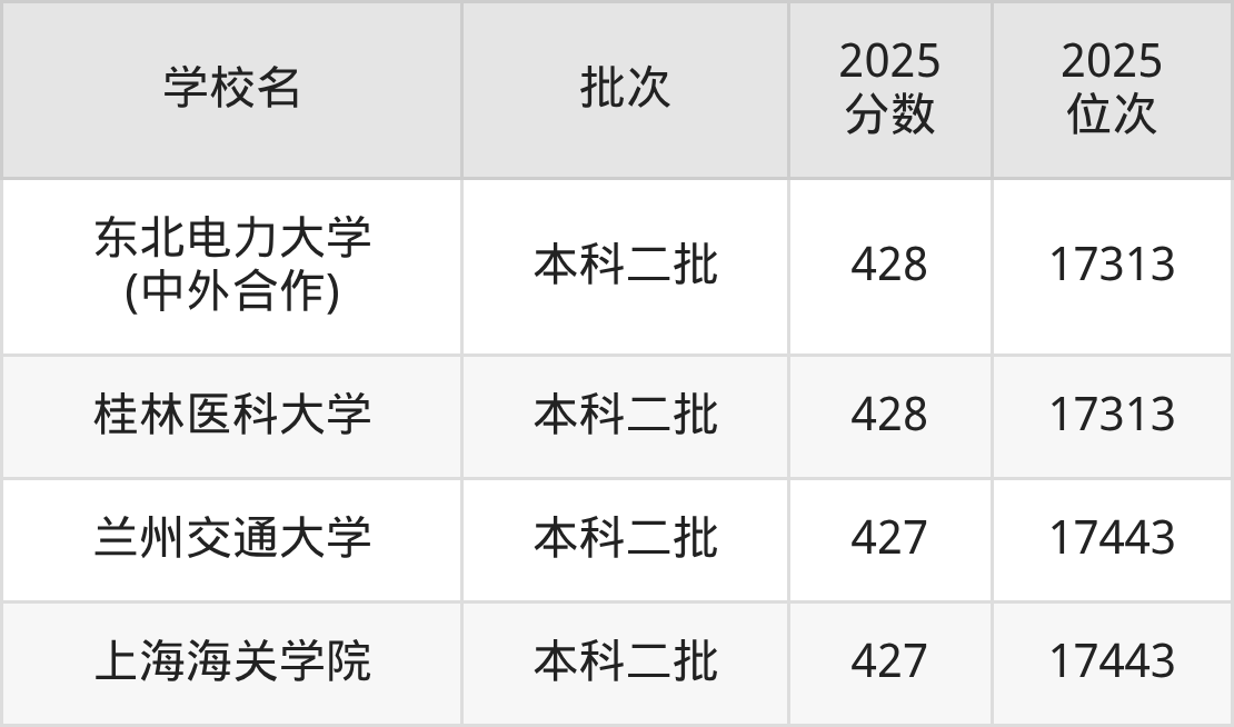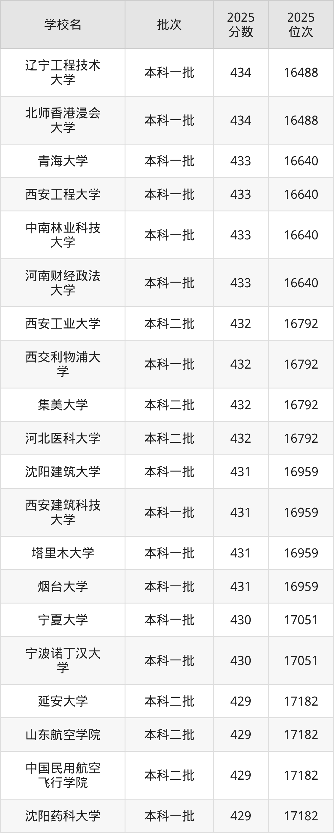 这些都是2026年高考理科16960名~17051名考生可以报考的大学,更多学校名单如下表所示:
