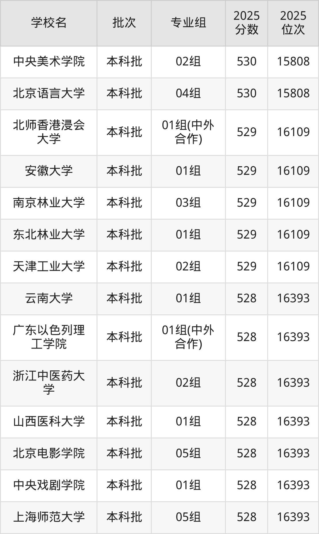 2025年上海高考529分(15809名~16109名)能上的大学有天津工业大学02组、东北林业大学01组、南京林业大学03组、安徽大学01组等。