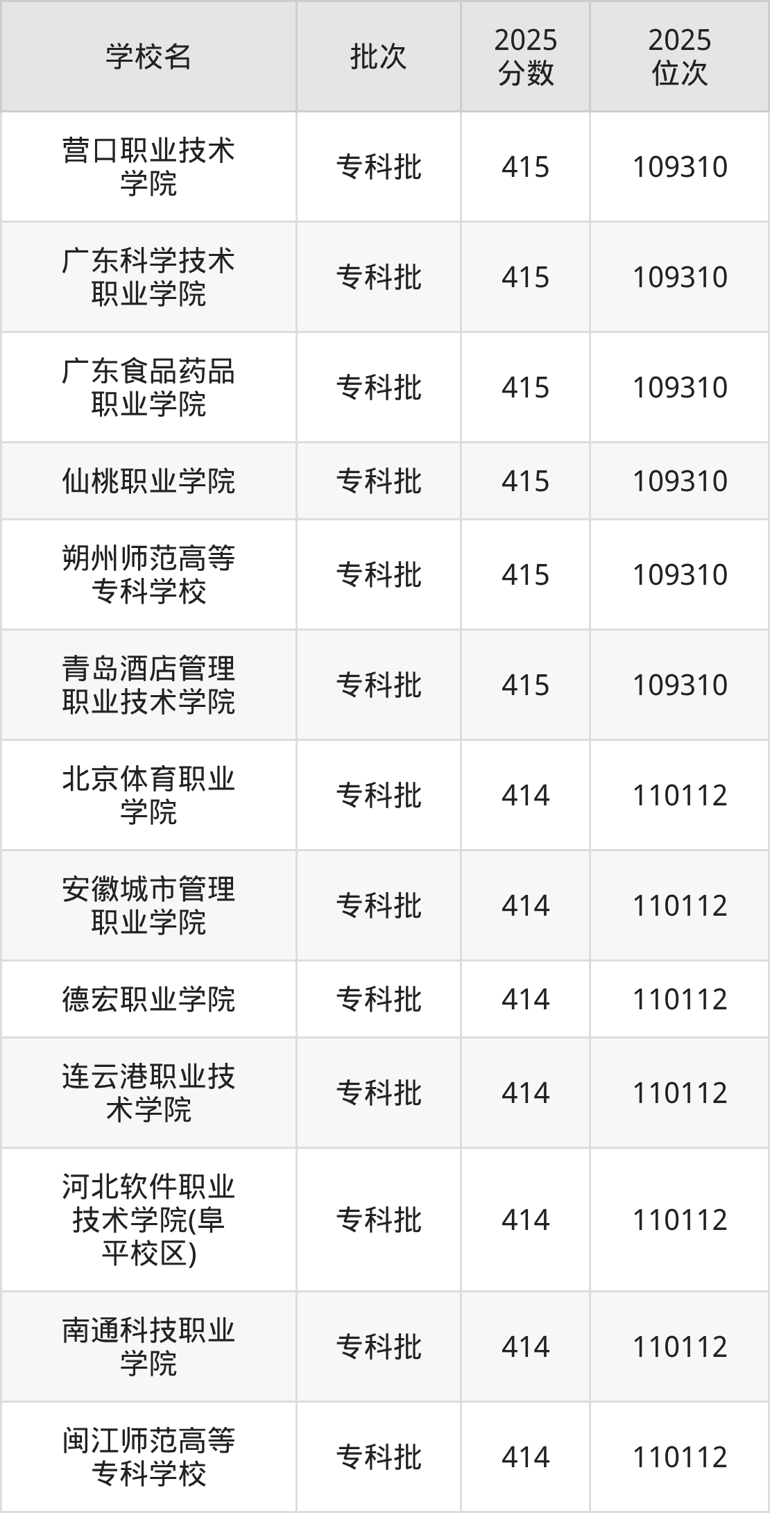 2025年河北高考历史类414分(109311名~110112名)能上的大学有德宏职业学院、北京体育职业学院、南通科技职业学院、闽江师范高等专科学校等。