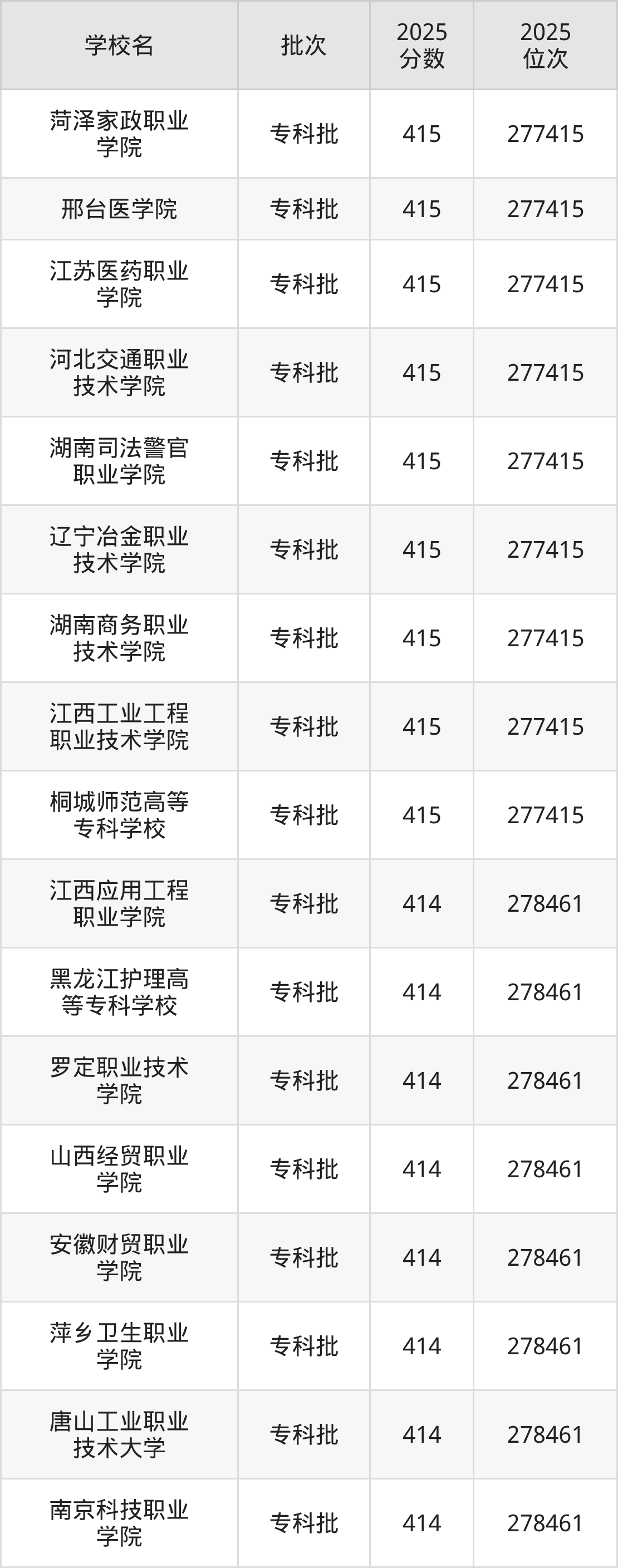 2025年河北高考物理类414分(277416名~278461名)能上的大学有南京科技职业学院、唐山工业职业技术大学、萍乡卫生职业学院、安徽财贸职业学院等。