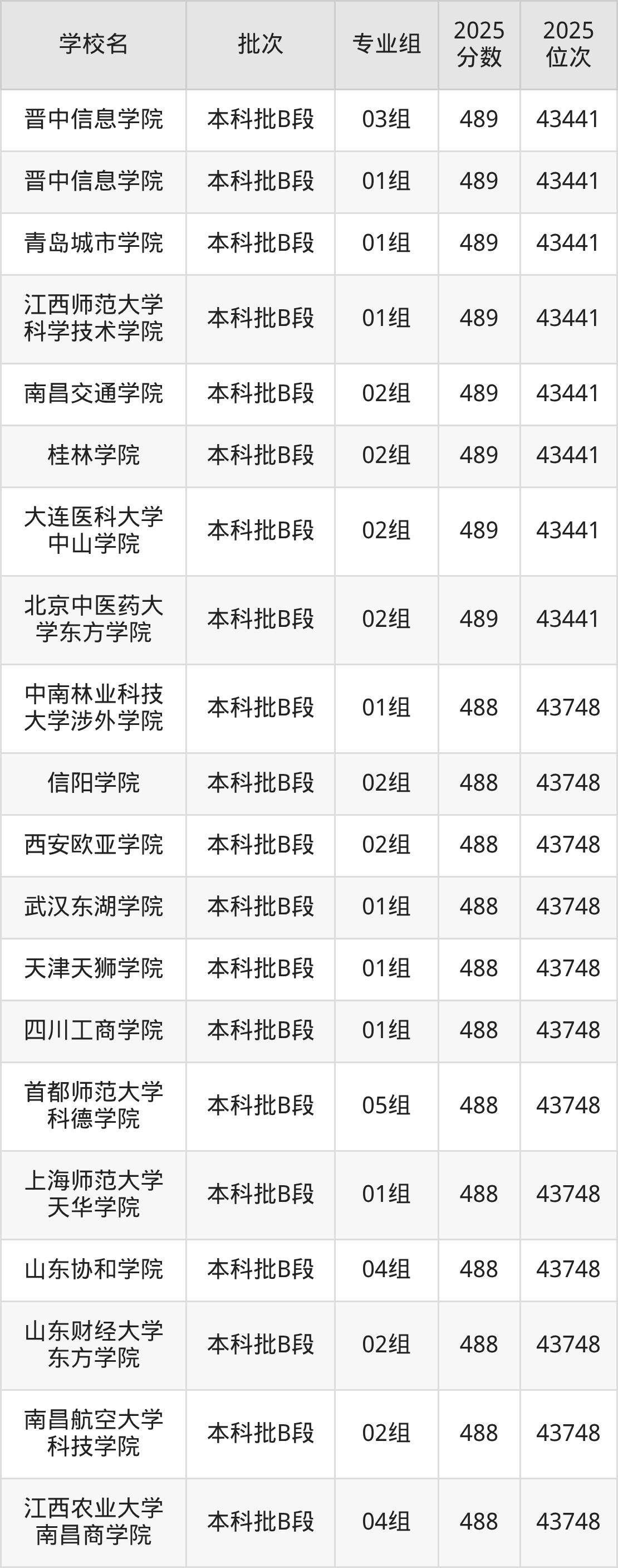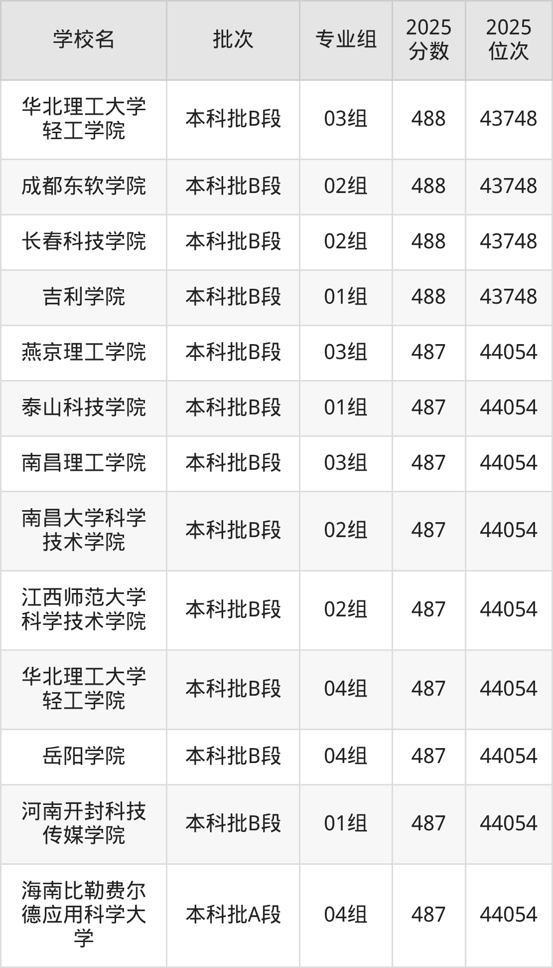 2025年天津高考488分(43442名~43748名)能上的大学有吉利学院01组、长春科技学院02组、成都东软学院02组、华北理工大学轻工学院03组等。