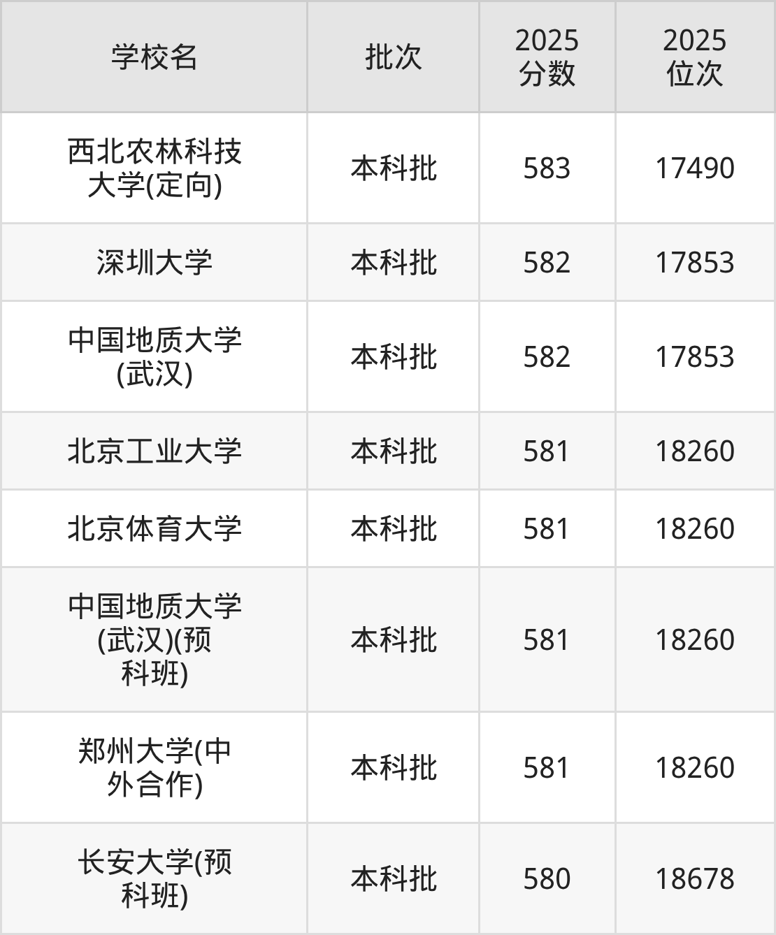 2025年重庆高考物理类581分(17854名~18260名)能上的大学有北京工业大学、北京体育大学、中国地质大学(武汉)(预科班)、郑州大学(中外合作)。